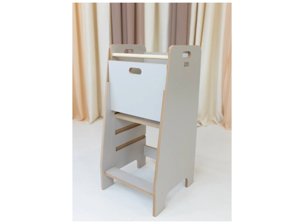 Zabudnite na stres - nadčasový dizajn Kitchen Helper Comfort poskytuje maximálnu bezpečnosť pre vaše dieťa. Pevné bočné steny a zadná stena (ktorá je vyberateľná) zabraňujú vypadnutiu dieťatka a stabilná základňa zaisťuje, že pomocník stojí pevne na svojom mieste. Môžete pokojne variť s vedomím, že váš malý pomocník je v bezpečí.