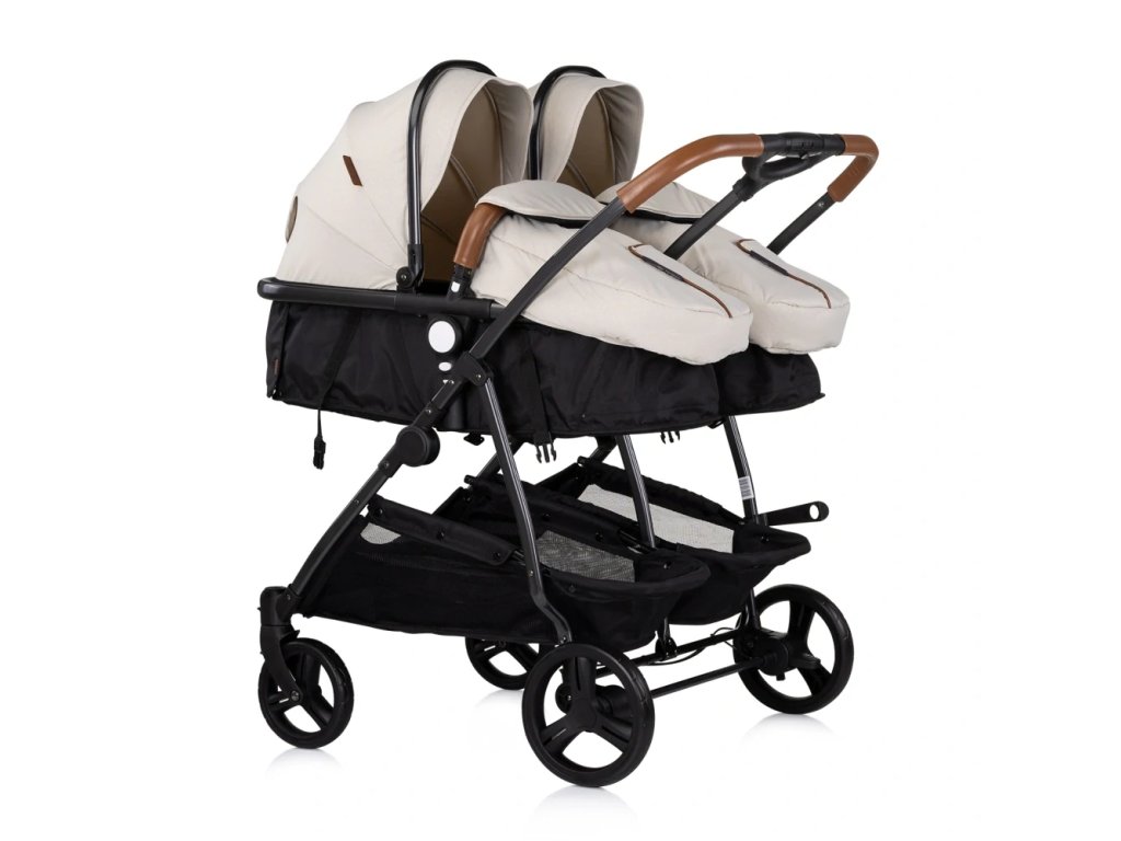 Sada obsahuje: Rám a dve sedadlá, ktoré sa dajú premeniť na prenosné vaničky, dva nánožníky, dve tašky na príslušenstvo, mäkkú vložku v každej sedacej jednotke.