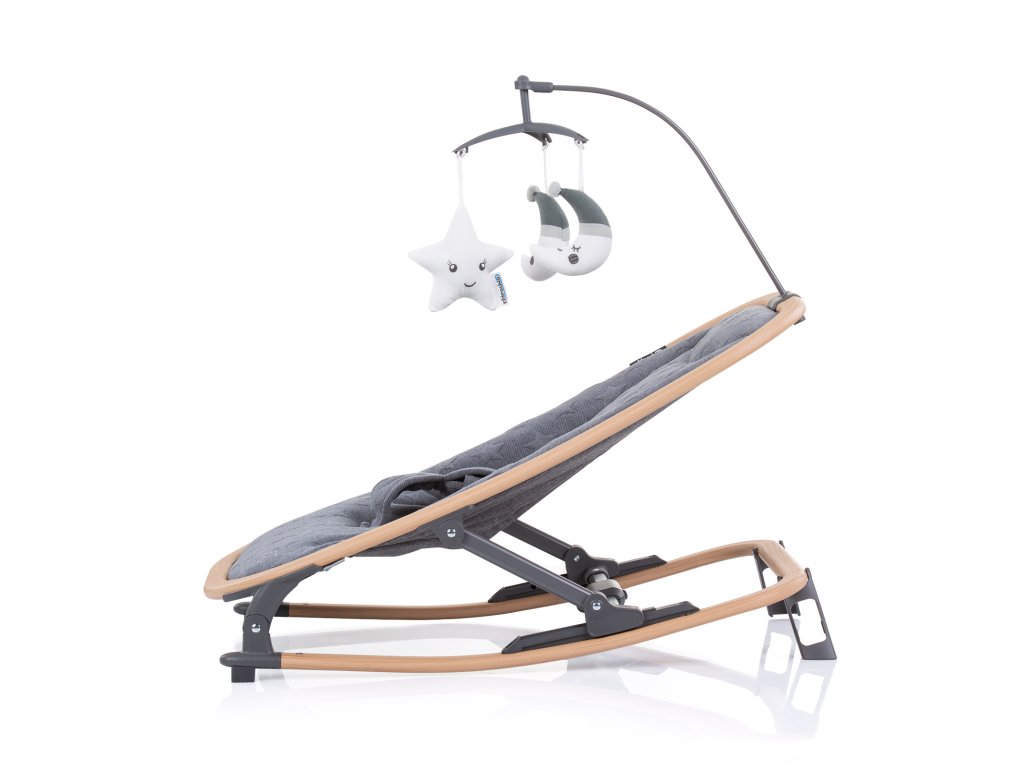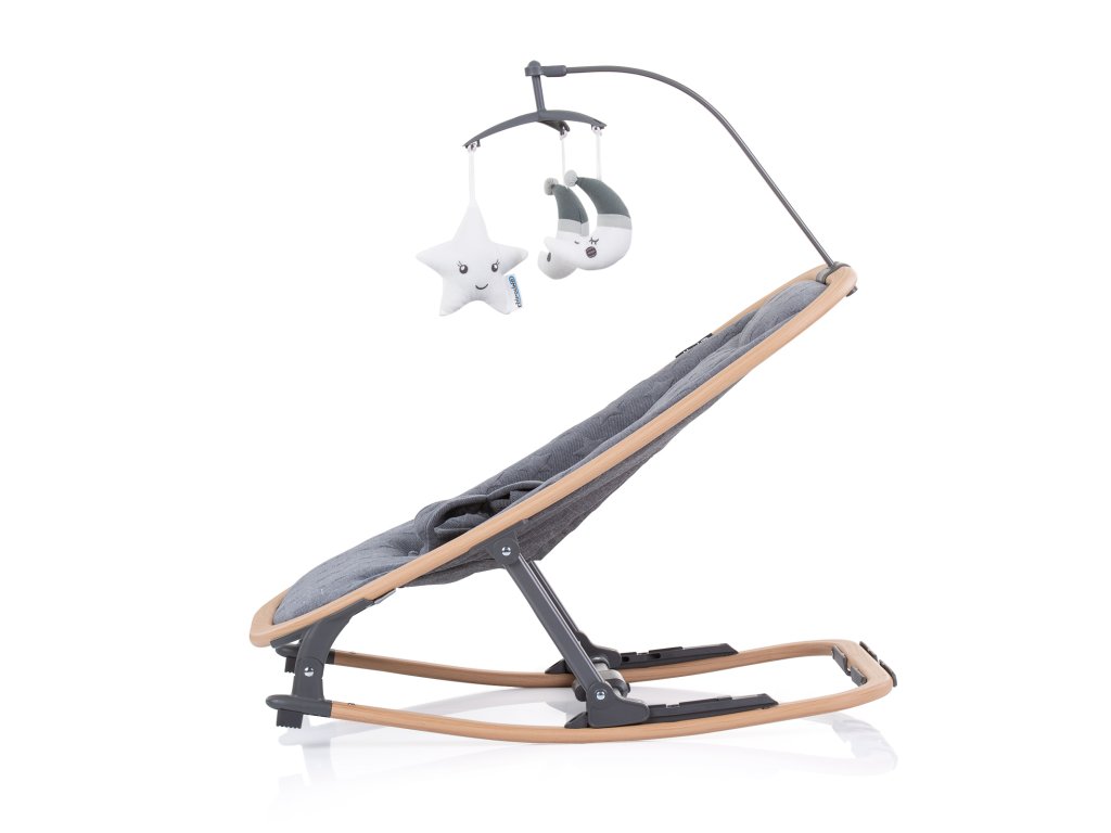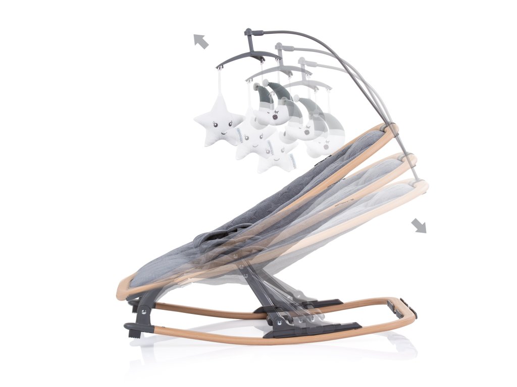 Detská hojdačka Velvet je ako stvorená na hru a spánok. Bábätko sa hračkami zabaví a môže odpočívať v úplne rovnom ležaní. Hojdačka pre dojčatá a malé deti, ktoré nevedia sedieť bez pomoci s hmotnosťou do 9 kg . Polohy chrbtovej opierky umožňujúce dieťaťu spať alebo hrať sa. Stojan so závesnými hračkami na zábavu dieťaťa.