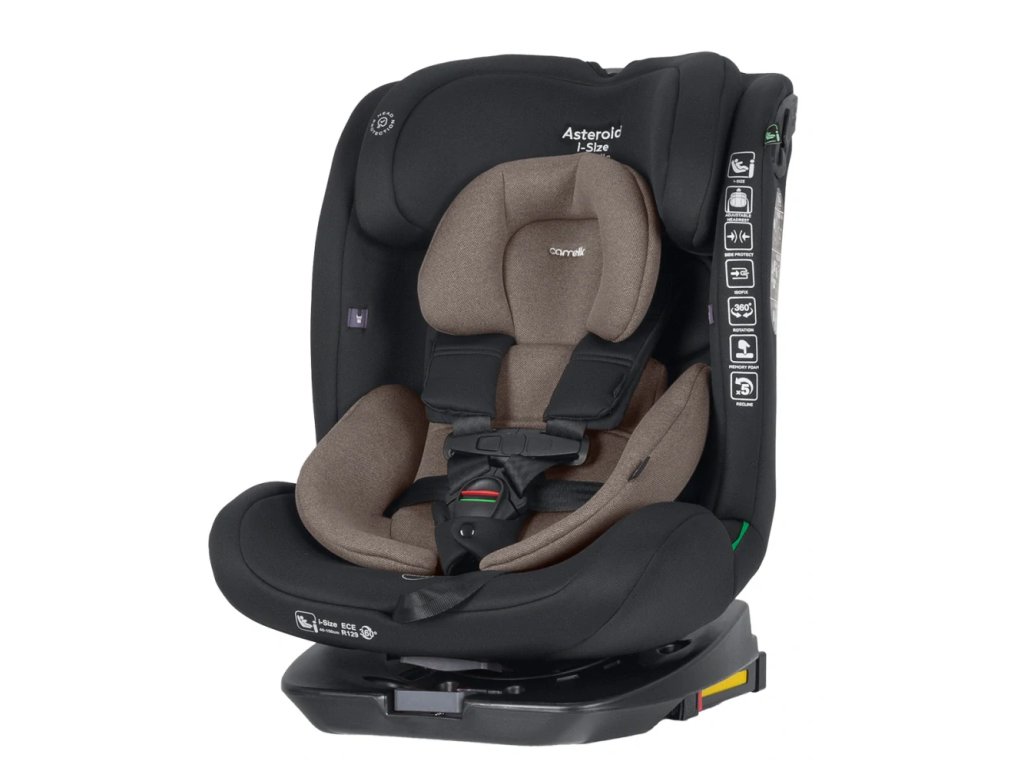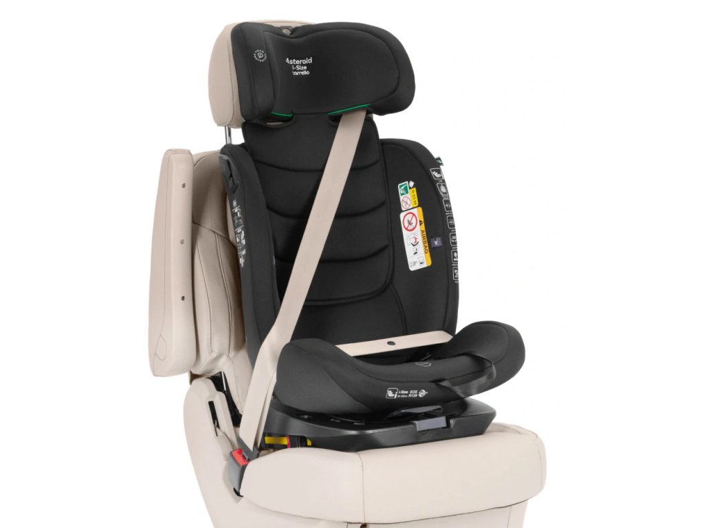 Autosedačka Asteroid i-Size Univerzálna detská autosedačka spĺňa moderný štandard I-Size. Je vybavený ochranou proti bočnému nárazu, upevňovacím systémom Isofix, Top Tether (kotviaci popruh) a otáčaním o 360°. Prídavný zámok pásu. Príklad inštalácie sedačky pre prepravu detí do 15 mesiacov, s výškou 40 až 105 cm (do 18 kg), v súlade s certifikačnou normou v európskych krajinách – I-SIZE R129/03. Maximálny uhol sklonu: 145°. Top Tether strap zaisťuje bezpečné upevnenie sedadla. Sada obsahuje anatomickú vložku (pre skupinu 0+). Používa sa na zabezpečenie vodorovnejšej polohy dieťaťa v autosedačke. Otáčanie o 360° umožňuje jednoduchú zmenu smeru sedenia a pohodlné nastupovanie malého cestujúceho. Uhol sklonu v polohe "smerom jazdy": 102°–114°. 3 polohy sklopenia. Vhodné na prepravu detí od 15 mesiacov (výška od 76 cm). Nastaviteľná opierka hlavy je vyrobená z materiálov z pamäťovej peny a ponúka 10 polôh, čo vám umožní prispôsobiť autosedačku podľa toho, ako dieťa rastie. Do výšky 105 cm (približne 18 kg) sa potom používajú vlastné pásy autosedačky, používajú sa bežné bezpečnostné pásy vozidla. Bezpečnosť dieťaťa zaisťuje pás a 5-bodový zámok s vysokou pevnosťou. Tlačidlo zámku má zelený indikátor zatvárania a zreteľný zvuk cvaknutia, ktorý zabraňuje nesprávnemu použitiu. Popruhy sú určené pre deti s hmotnosťou do 18 kg.