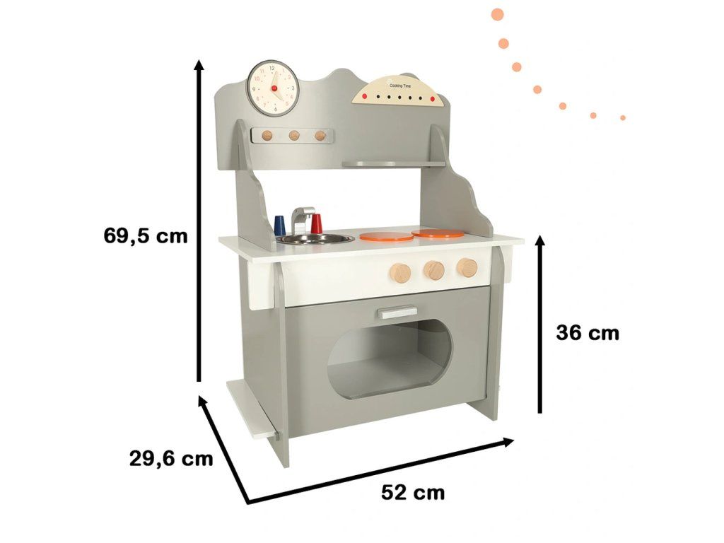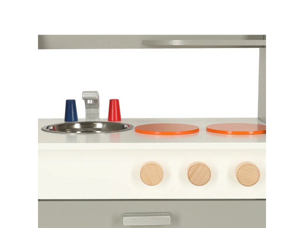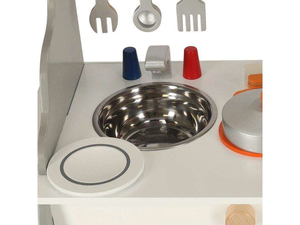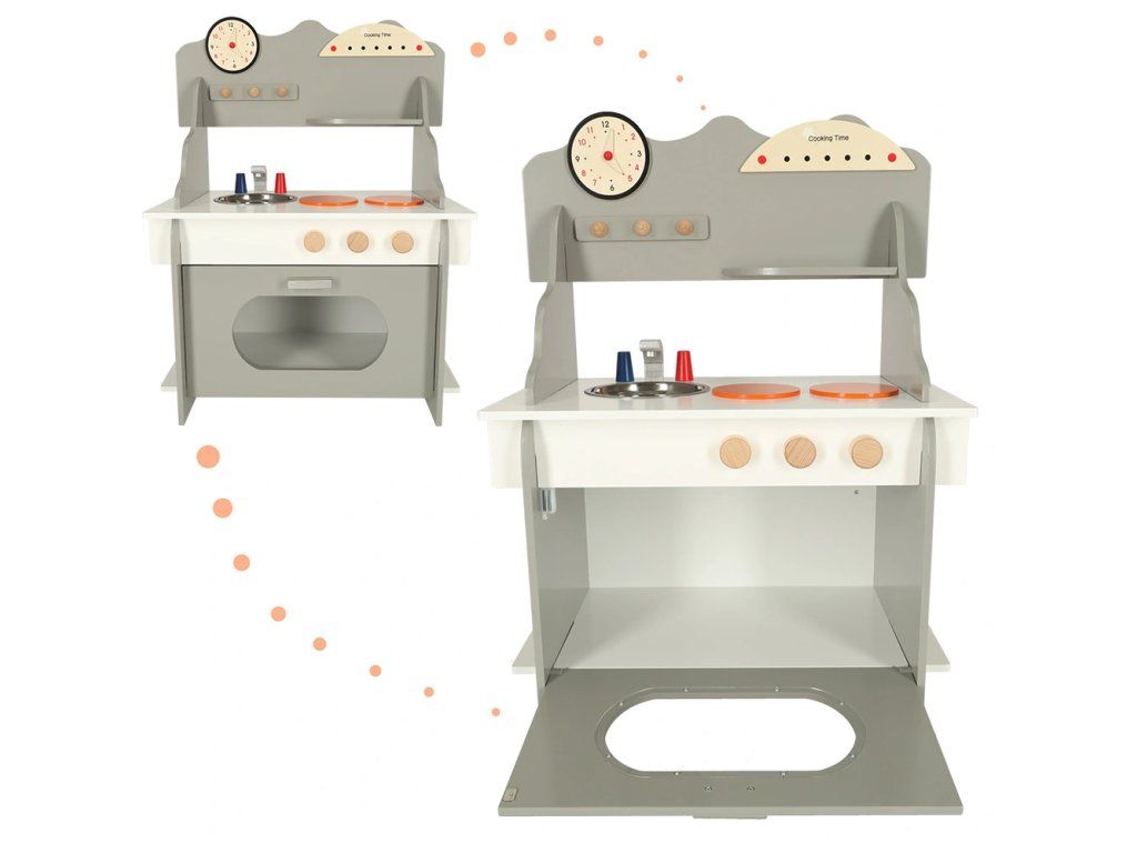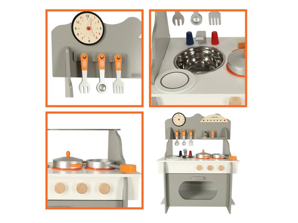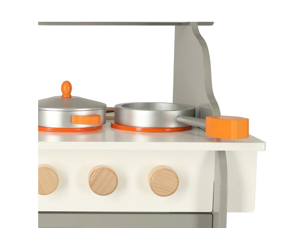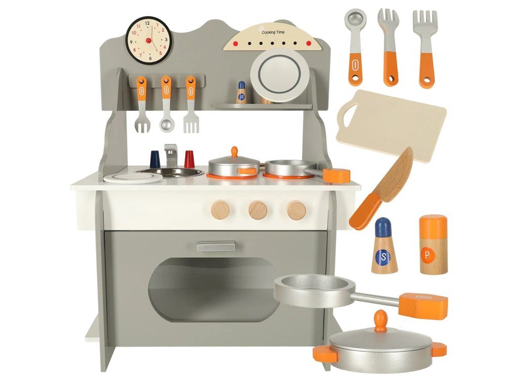 Detská drevená kuchynka so všetkým potrebným vybavením – veľká rúra, drez a varná doska. Kuchynka je dodávaná s príslušenstvom ako panvica,hrniec s pokrievkou, špachtľa, koreničky a doska na krájanie s nožíkom . Dokonale rozvíja kreativitu a aj manuálnu zručnosť.