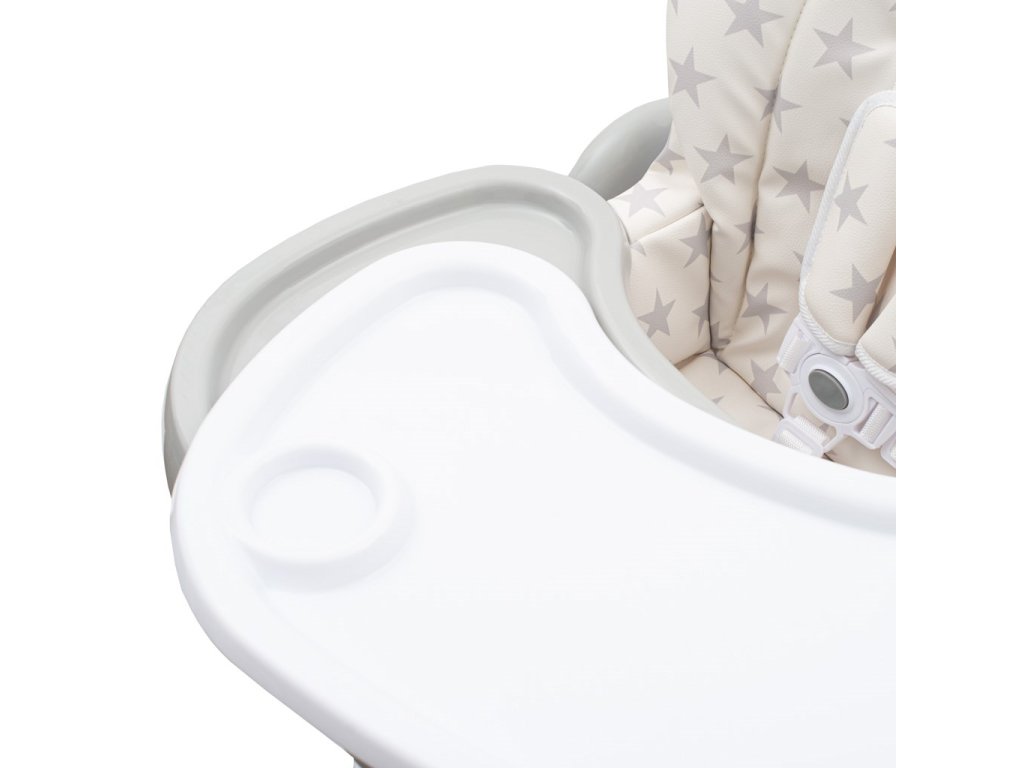 Luxusná detská jedálenská stolička New Baby Grey Stars je veľmi pohodlná a spája bezpečí, praktické využitie a vysokú variabilitu. Poťah stoličky, ktorý je vyrobený z vysoko kvalitnej ekokože, je mäkký a príjemný na dotyk a potlačený krásnym vzorom. Bezpečnostné pásy sú vybavené chráničmi, ktoré zaisťujú komfort vášho dieťaťa. Stolička sa veľmi jednoducho skladá a nastavuje.