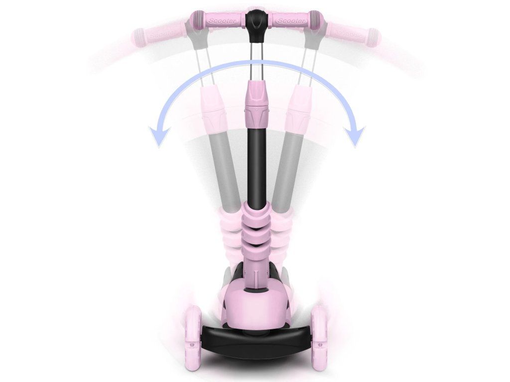Riadenie prebieha len vyvažovaním karosérie, bez otáčania volantom. Stačí sa mierne nakloniť požadovaným smerom – a je to! Dieťa si rýchlo osvojí túto techniku jazdy a zároveň si trénuje zmysel pre rovnováhu. Kolobežka pri otáčaní zostáva stabilná vo vertikálnej polohe vďaka trom kolieskam.