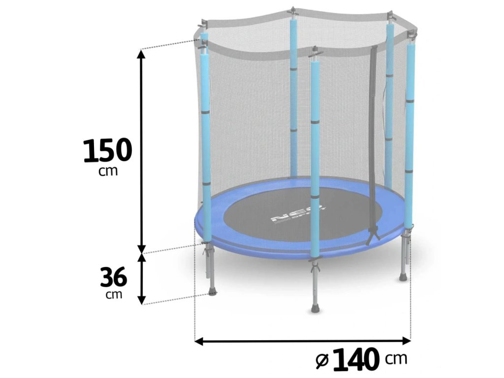 Trampolína Neo-Sport s priemerom 140 cm je bezpečné a stabilné športové vybavenie. Ochranná sieť je vybavená odolným zipsom. Stĺpiky rámu sú pokryté hrubou špongiou a pružiny zaisťujúce rohož sú pokryté špeciálnym ochranným golierom s penou vo vnútri. Takéto riešenia zaručujú bezpečné používanie trampolíny a ochranu pred mechanickým poranením.
