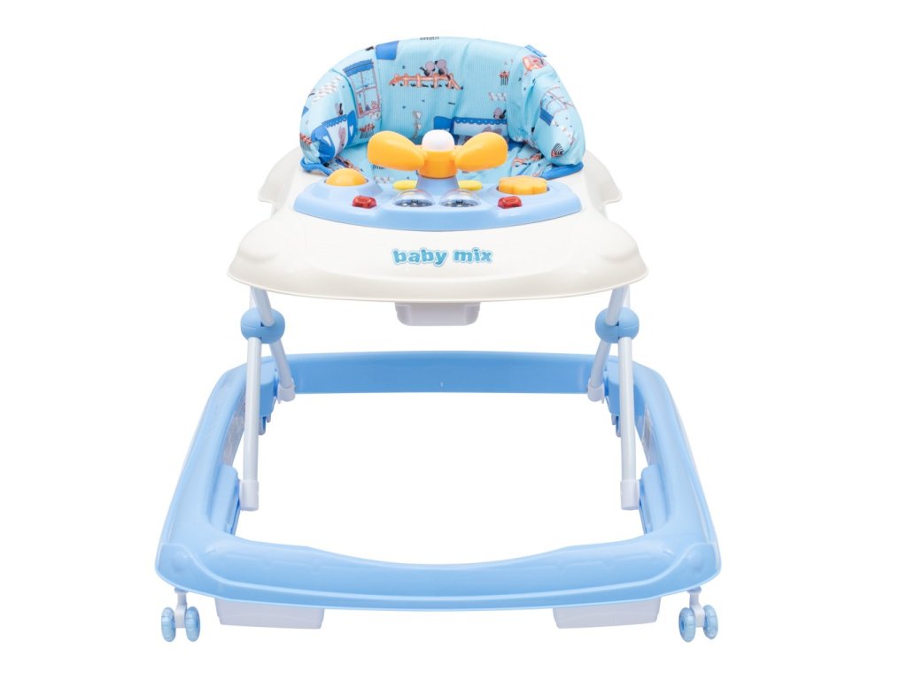Multimediálne chodítko Baby Mix so silikónovými kolieskami. Chodítko je vybavené pohodlným ergonomicky tvarovaným sedadlom, ktoré zaisťuje správne držanie chrbtice. Multimediálny panel obsahuje rôzne svetelné efekty, trúbiaci volant, ktorým možno otáčať, tlačidlá pre prehrávanie melódií a dve svetlá. Krásne chodítko s hračkami očarí malých objaviteľov a umožní im hrať sa ešte dlhšie. Chodítko je vybavené špeciálnym systémom proti prevráteniu, ktorý zaistí Vášmu dieťaťu pohodlie a bezpečnosť.