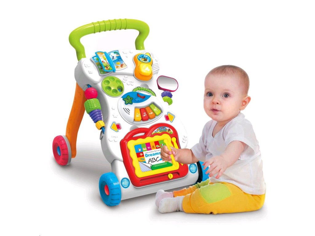 Detské hrajúce edukačné chodítko Baby Mix vo veselých farbách so štyrmi kolieskami. Chodítko má telefón, ktorý vydá klikacie zvuky a môžeme ho demontovať a podať dieťaťu. Ďalej, krásnu farebnú knižôčku, v ktorej dieťa môže otočiť stránku, tabuľu na ktorú môže písať a vymazávať svoje dielka. Tabuľu možno tiež demontovať. Ďalšou časťou chodítka je mini piáno, na ktoré môže dieťa hrať a púšťať si zvuky a rôzne melódie, svetielka v tvare hviezdičky a mesiačika a po bokoch chodítka sú hračky a zrkadielko. Vyrobené z kvalitného plastového materiálu. Rozmer: výška cca 45-48 cm. Batérie nie sú súčasťou balenia ( 2x AA LR6). Určené pre deti od 12 mesiacov.