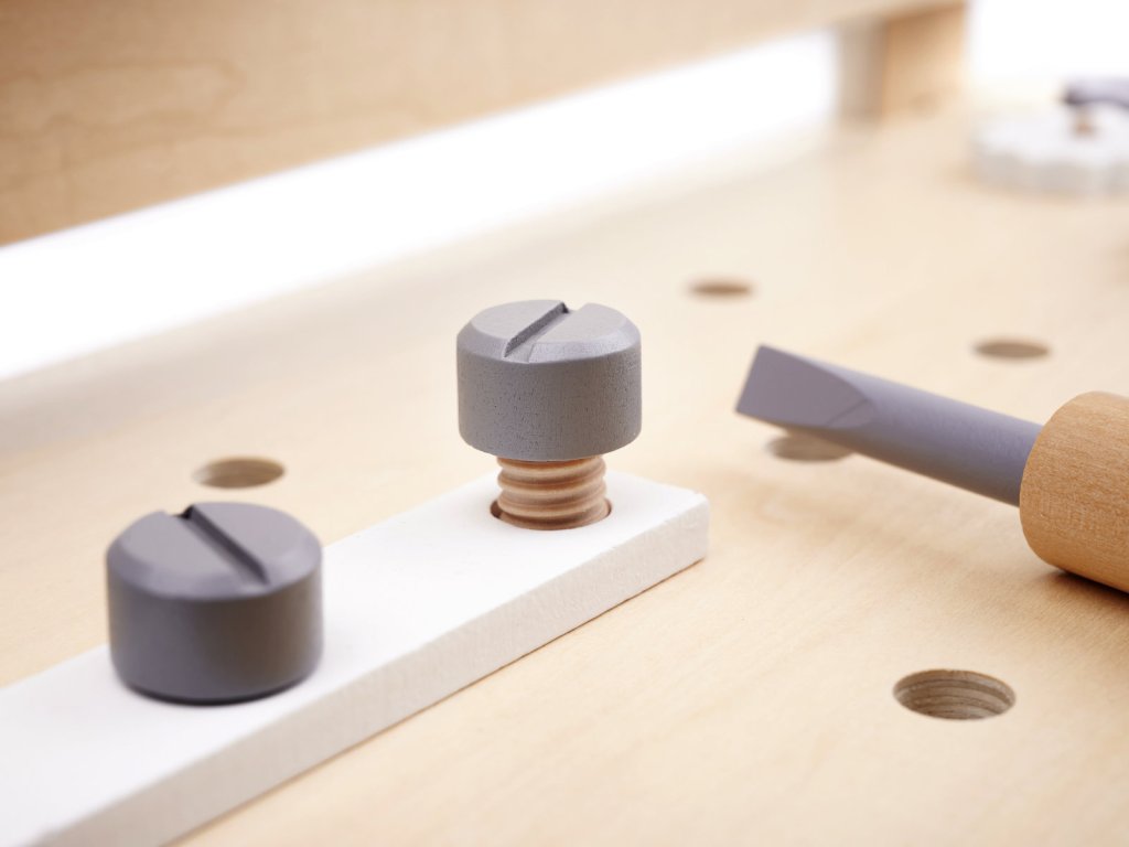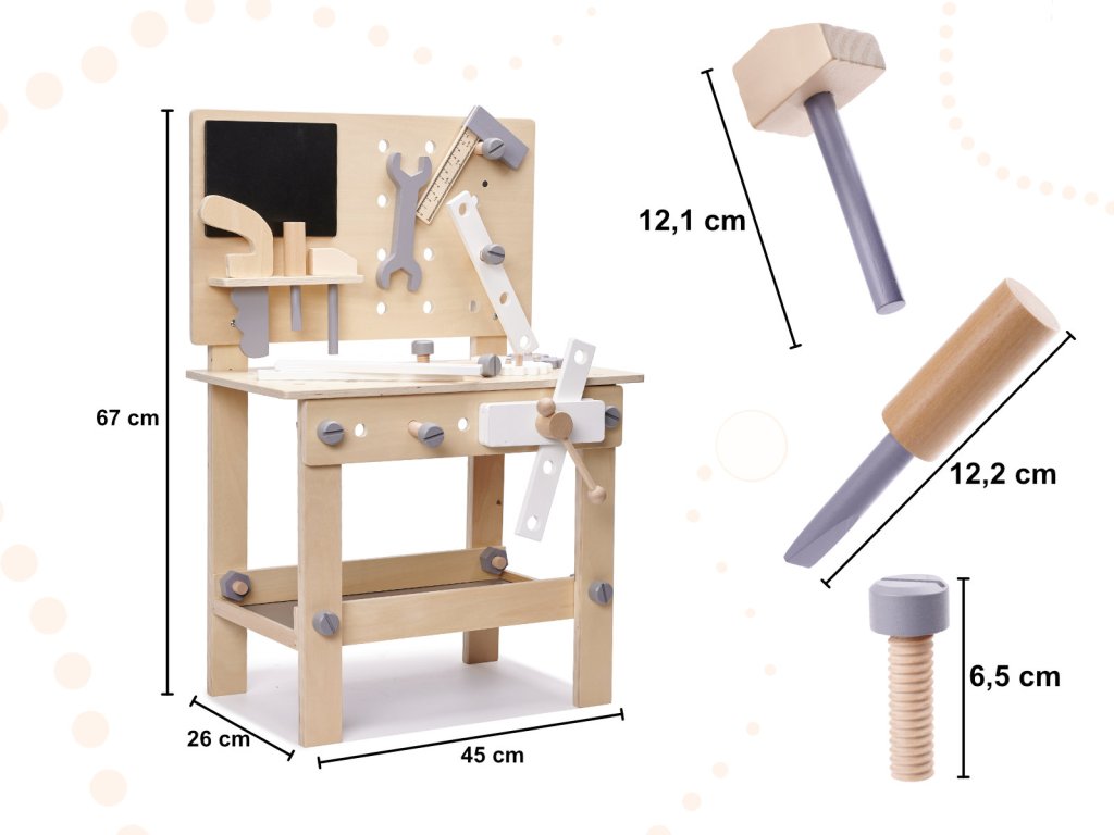Drevený pracovný stôl pre deti je hračka pre chlapcov a dievčatá ! Zaskrutkovaním drevených skrutiek, experimentovaním s kľúčom alebo inými pomôckami si deti zaujímavým a pútavým spôsobom rozvíjajú svoje motorické schopnosti. Hračka navyše podporuje logické myslenie a stimuluje kreativitu. Veľká sada náradia a drevený stolík na náradie budú snom každého malého „šikovného majstra“!