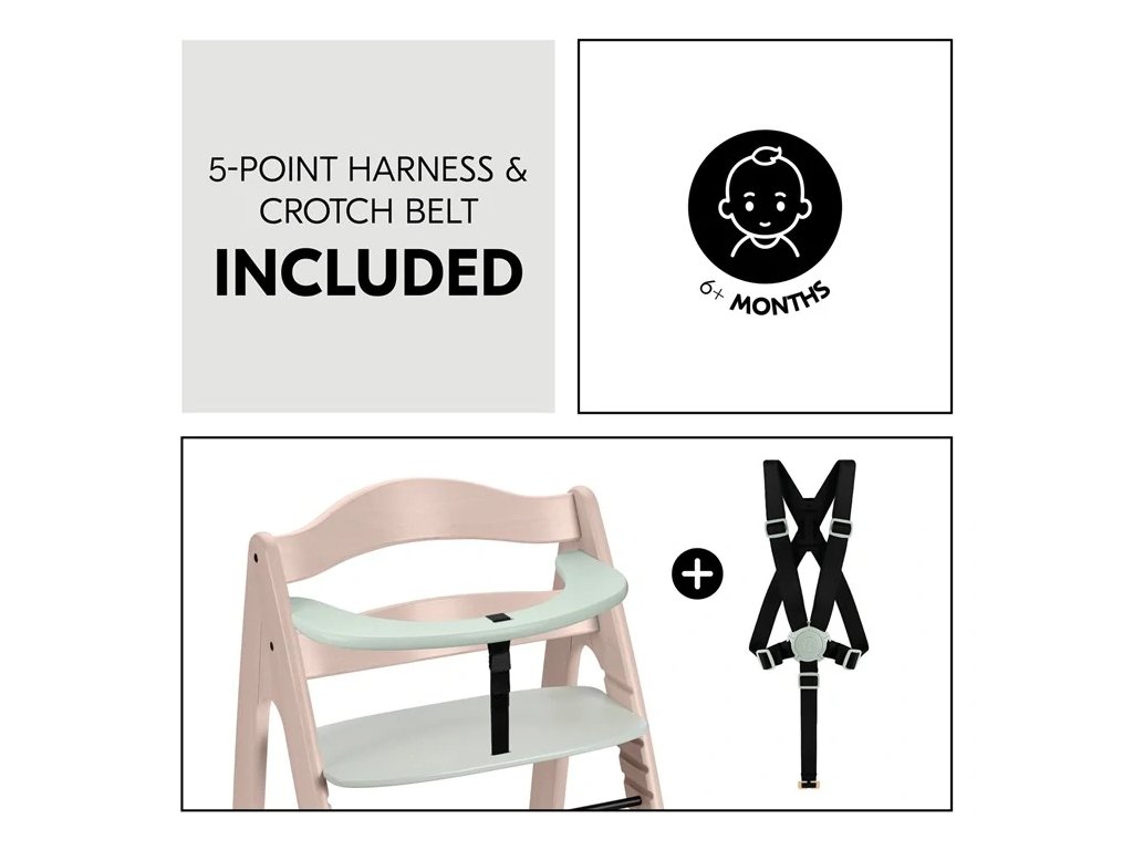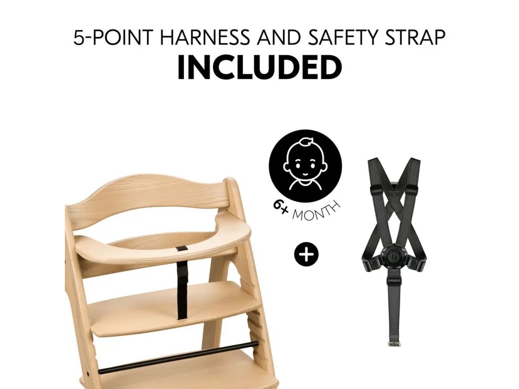 Všetko, čo vaše dieťa potrebuje, aby sedelo bezpečne, je súčasťou balenia. Pás v rozkroku, 5-bodový pás a predný pás drží vaše dieťa v bezpečí, takže si môžete užívať jedlo. Vhodné od veku 6 mesiacov.