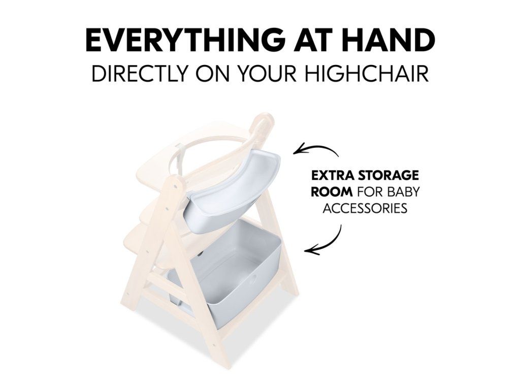 VŠETKO NA RUKU // Praktická súprava pozostávajúca z malého boxu s vekom a veľkého boxu poskytuje ďalší úložný priestor na vysokej stoličke (Alpha+ / alebo Beta+) a udržiava poriadok na vašom jedálenskom stole.