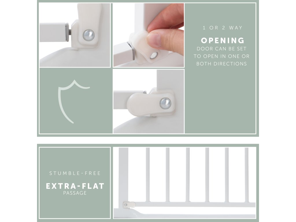 Táto bezpečnostná brána má extra plochý priechod, ktorý poskytuje osobitnú bezpečnosť pri inštalácii na vrchole schodiska, aby ste nezakopli.