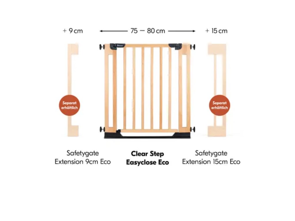 vďaka priloženým nastavovacím skrutkám sa dá flexibilne nastaviť od 75 do 80 cm – vytvára tak bezpečné prostredie, kde sa vaše dieťa (do 24 mesiacov) môže bez obáv plaziť. A so samostatne dostupným predĺžením bezpečnostnej zábrany Eco môžete bezpečnostnú zábranu predĺžiť až na 110 cm.