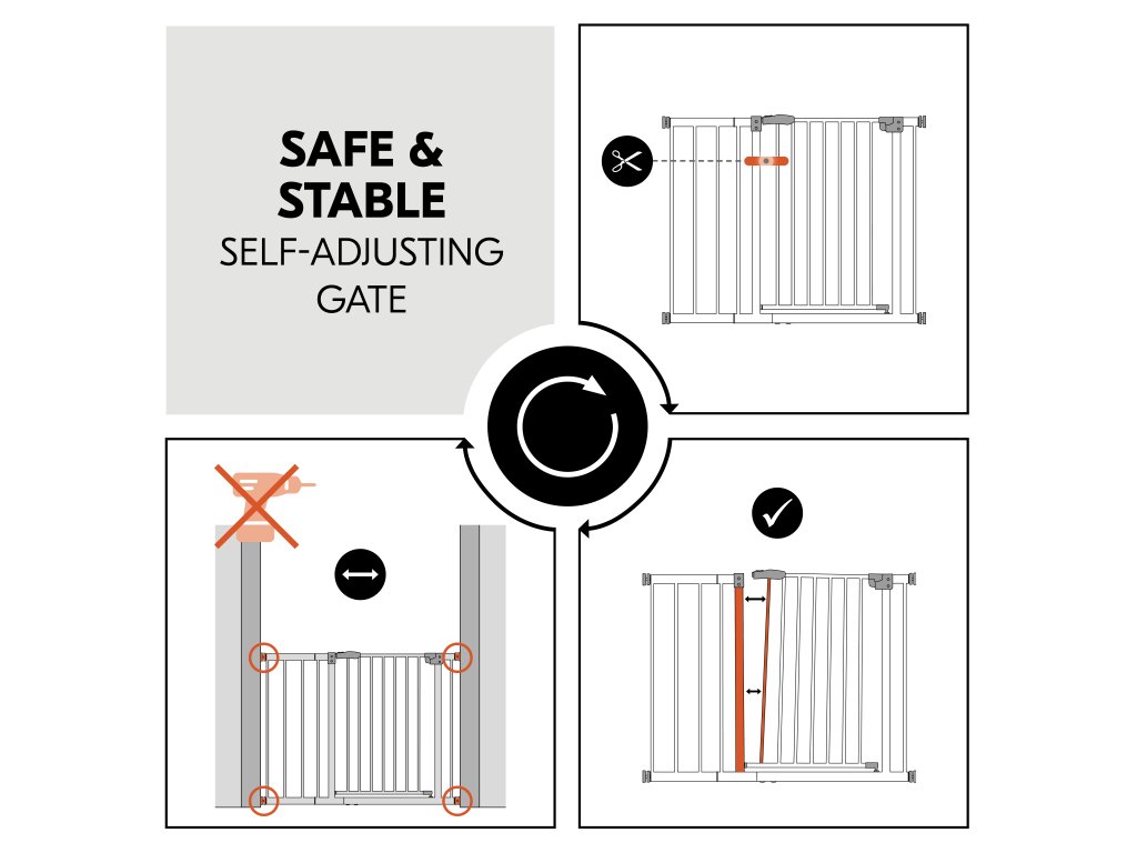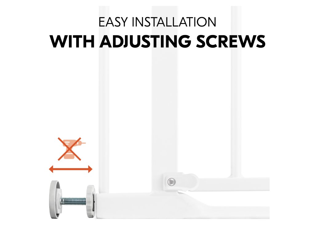 Sada pozostávajúca zo zábrany a 21-cm kovový nadstavec, je vhodná na schody resp dvere so šírkou 96–101 cm. Vďaka nastavovacím skrutkám môžete rýchlo a stabilne zábranu upevniť na miesto .