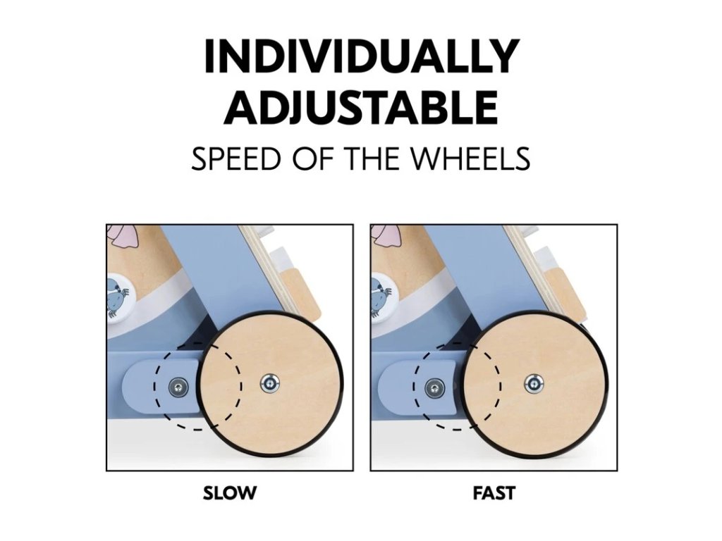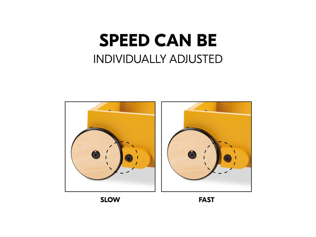 INDIVIDUÁLNE NASTAVITEĽNÁ RÝCHLOSŤ KOLIES // Na začiatku môžete znížiť rýchlosť kolies utiahnutím dvoch bočných bŕzd. Keď je vaše dieťa istejšie, môžete brzdy opäť uvoľniť.