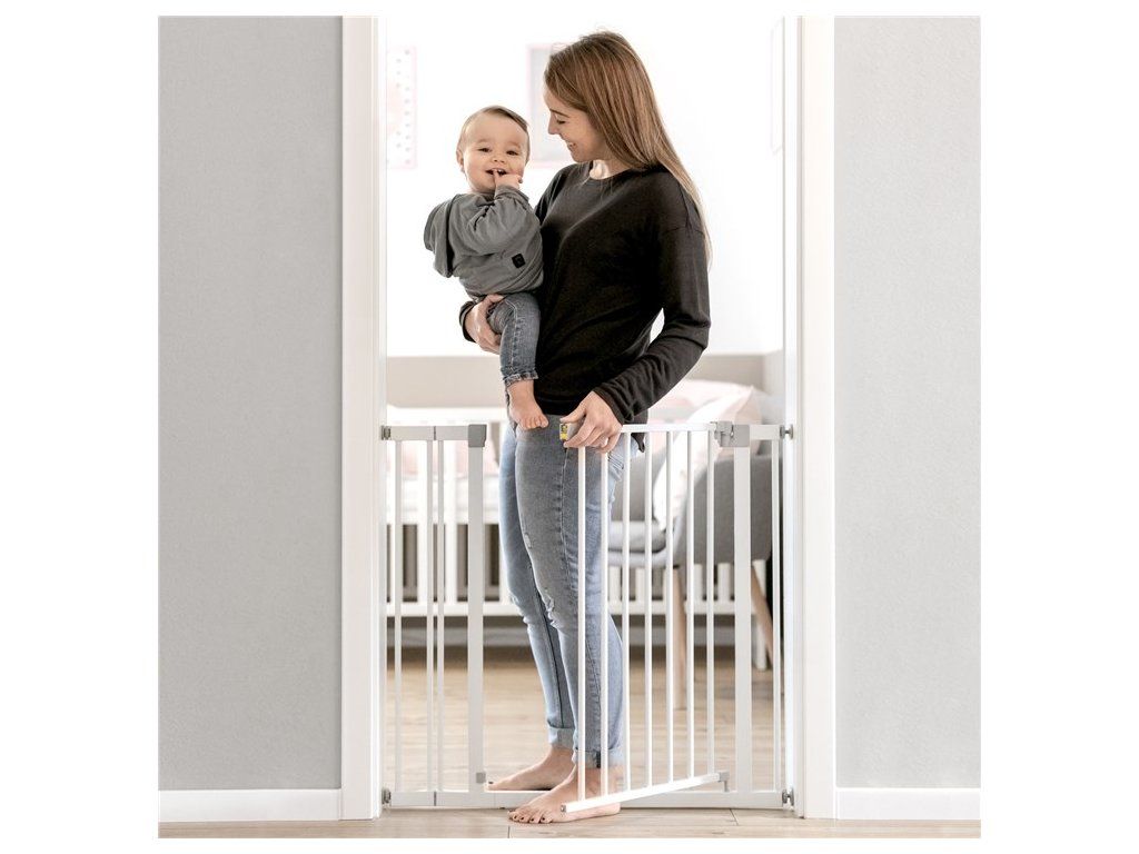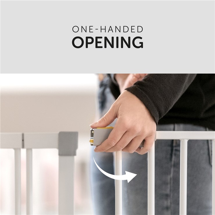 Dvojitý zámok zabraňuje nekontrolovanému otváraniu zábrany, dospelí môžu otvoriť dvere v oboch smeroch jednou rukou.