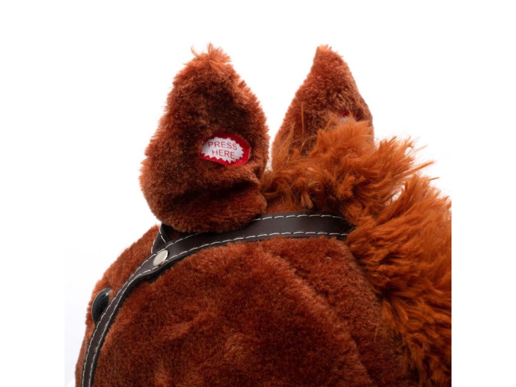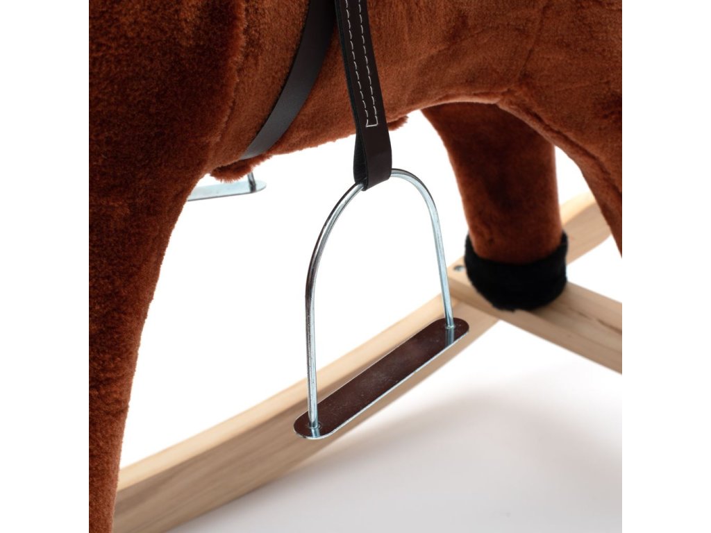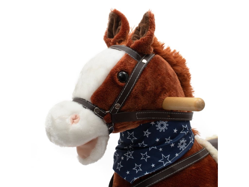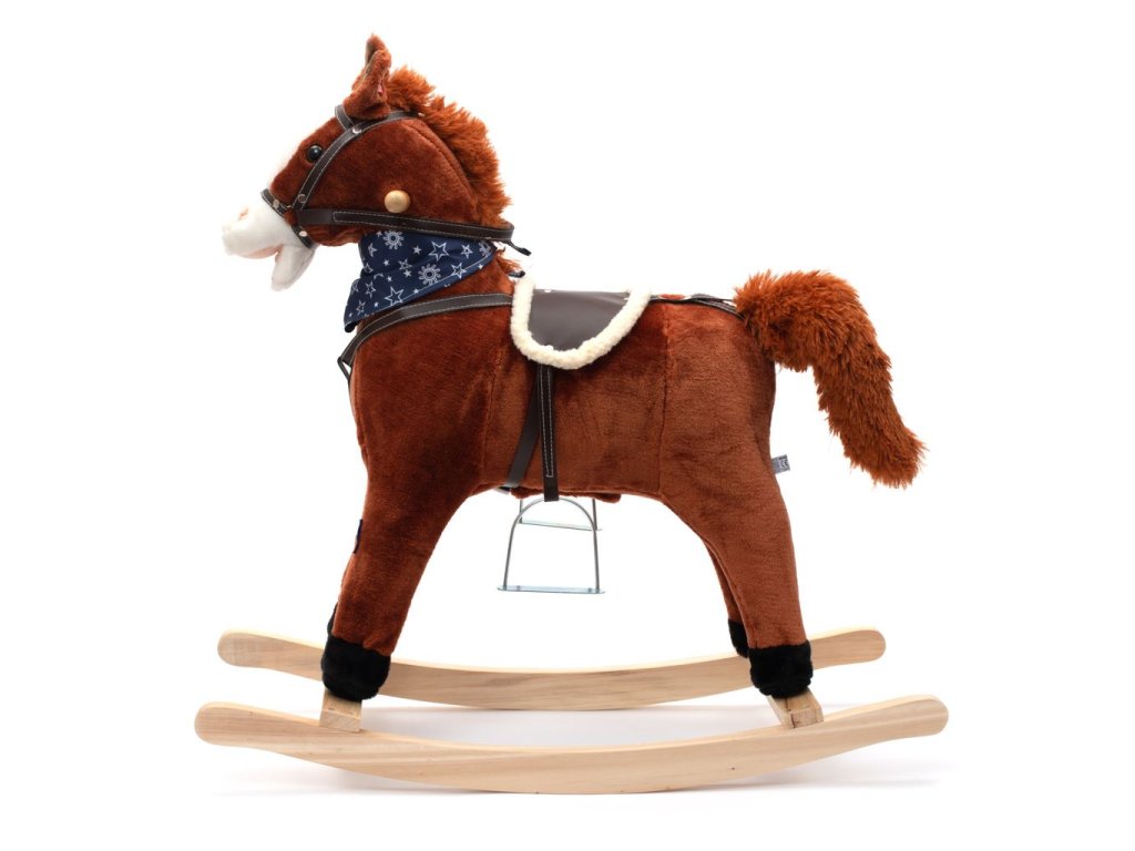 Mäkučký hojdací koník Baby Mix bol navrhnutý pre deti, ktoré majú rady dobrodružstvo. Vyzerá ako skutočný, takže sa vaše dieťa bude cítiť ako skutočný jazdec. Koník je vyrobený z mäkkého plyšu, okolo krku má ozdobnú šatku a je vybavený drevenými hojdacími lištami, ktorých profil chráni dieťa pred prevrátením. Pohodlné sedlo, pevná uzda, kovové strmene, drevené rukoväte a stabilné hojdacie lišty zaistia vašim kovbojom ešte väčšiu stabilitu a pohodlie počas hojdania. Je vyrobený z mäkkého plyšového materiálu, pevné drevené lišty alebo rukoväte je možné ľahko odskrutkovať. Po stlačení tlačidiel na uškách koník vrtí chvostíkom, hýbe tlamičkou, ozvú sa zvuky cvalu, koník zaerdží a zaspieva kovbojskú pesničku. Tri potrebné batérie AA 1,5 V sa vkladajú do púzdra umiestneného na brušku koníka a nie sú súčasťou balenia. Počas hojdania sa dieťa učí koordinovať pohyby svojho tela s koníkom, čo zlepšuje celkovú rovnováhu a motoriku dieťaťa.