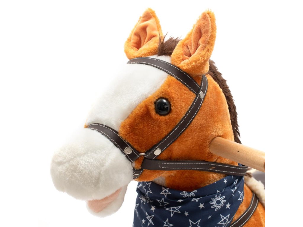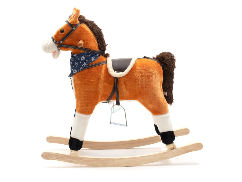 Neobyčajne krásny hojdací koník s červenou šatkou na krku. Po stlačení ušiek koník zavrtí chvostíkom, otvára ústa, vydáva zvuky klusajícího koňa alebo spieva pesničku. Pohodlné sedlo, pevná uzda, drevené rukoväte alebo kovové strmene zaistia vašim kovbojom ešte väčšiu stabilitu a komfort počas hojdania. Je vyrobený z mäkkého plyšového materiálu, pevnej drevenej lišty a rukoväte, ktorú možno ľahko odskrutkovať. Batérie sa vkladajú do púzdra umiestneného na brušku koníka.