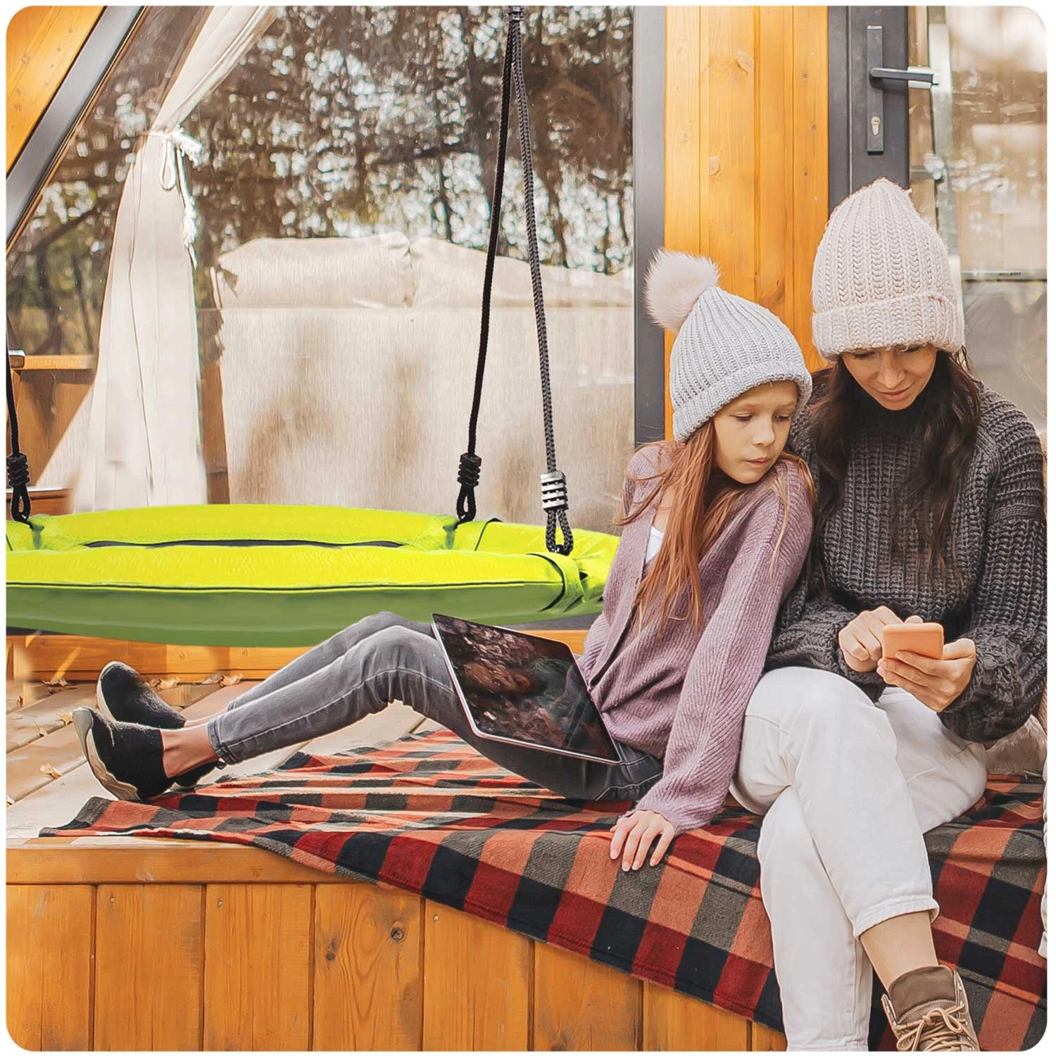 Hojdačka na oceľovom ráme potiahnutom mäkkou ochrannou penou, vyrobená z pevného materiálu s viacnásobným prešívaním a na hrubých závesných lanách. Poskytuje bezpečnosť, stabilitu a odolnosť.