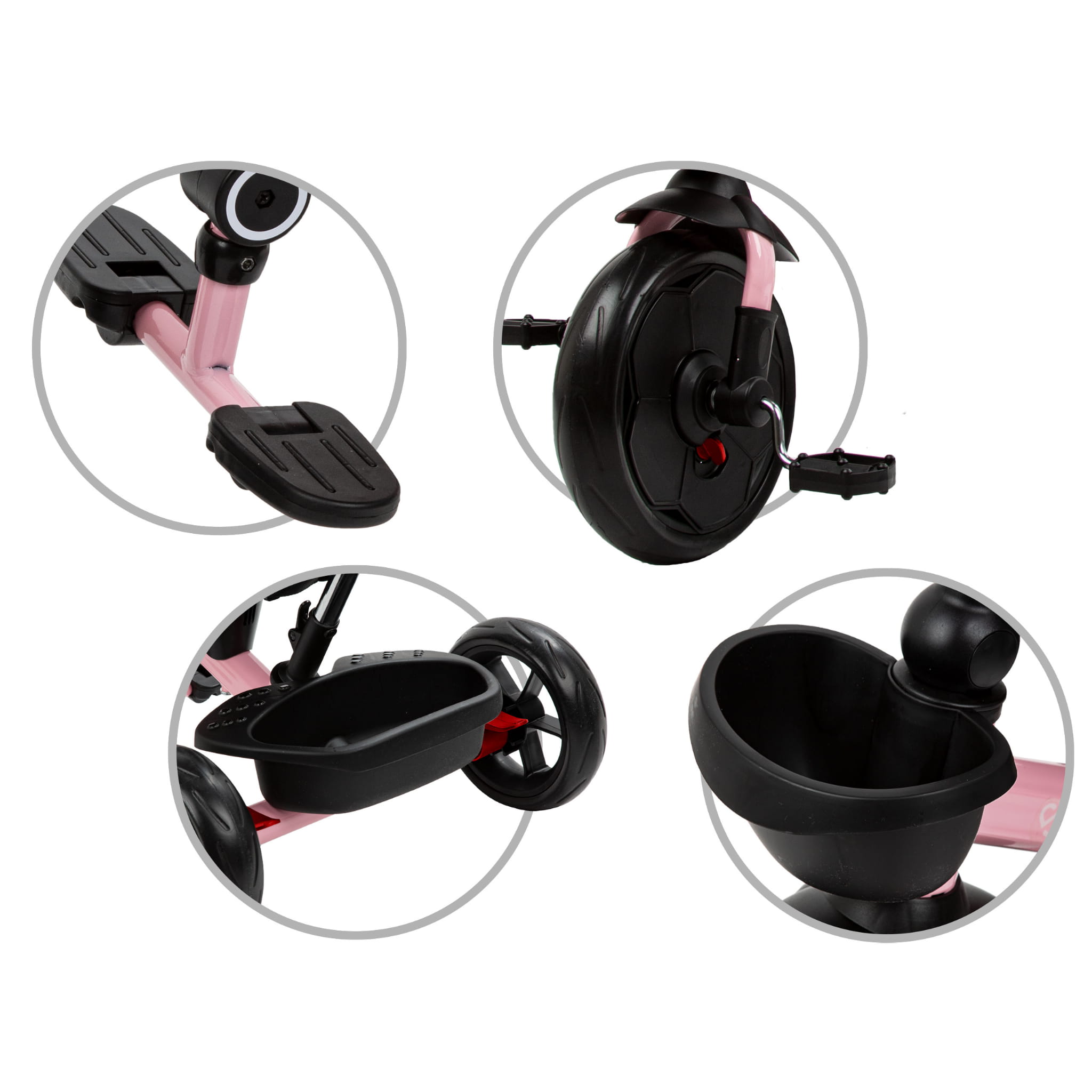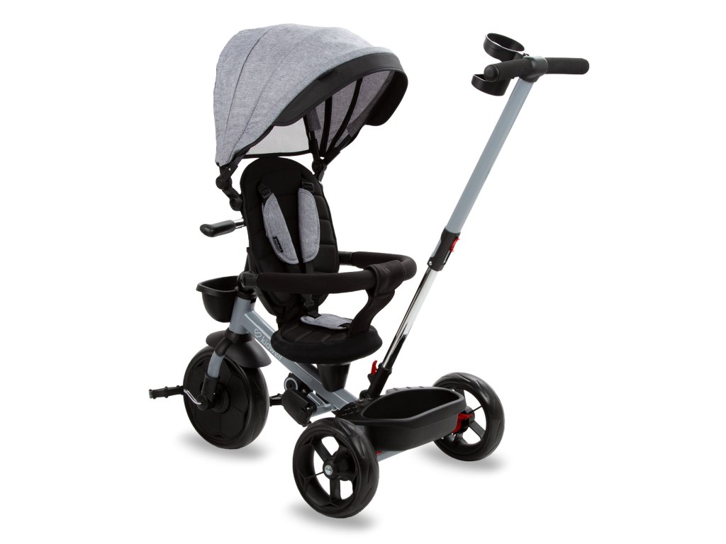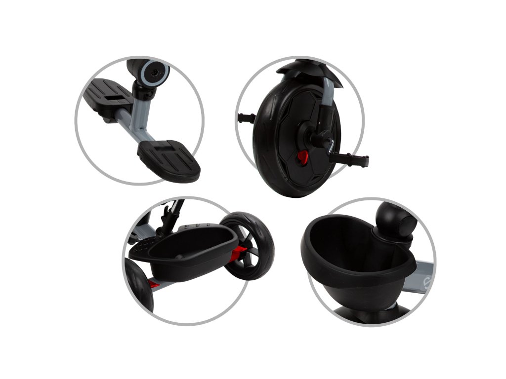 Predné koleso je vybavené blatníkom, ktorý chráni pred postriekaním Funkcia „voľné koleso“ vám umožňuje povoliť alebo zakázať schopnosť dieťaťa samostatne riadiť a riadiť bicykel .Brzdy na zadnej náprave kolies sú dve nezávislé páky, ktoré znehybňujú vozidlo, zabraňujú nekontrolovanej jazde a zaisťujú bezpečnosť .Pohodlné sedadlo potiahnuté protišmykovým poťahom, znehybnené a chránené proti pošmyknutiu počas jazdy .Sedačka má funkciu otáčania okolo vlastnej osi, takže dieťa môže sedieť tvárou alebo tvárou k rodičovi .