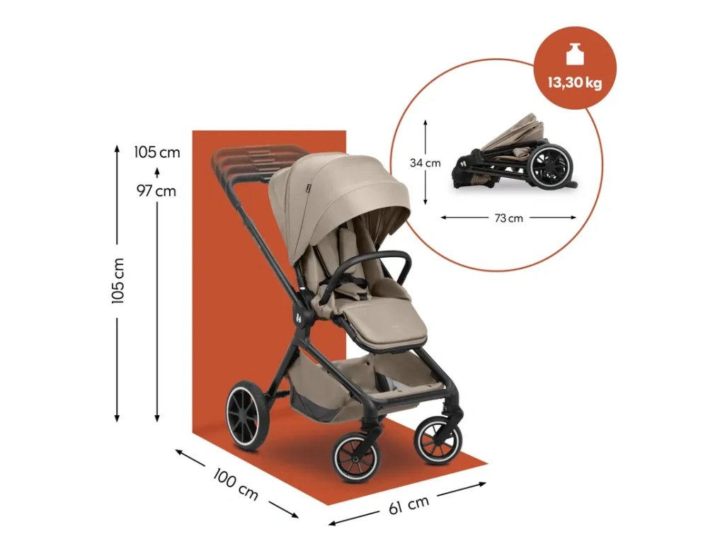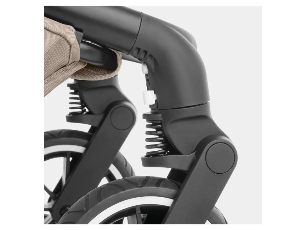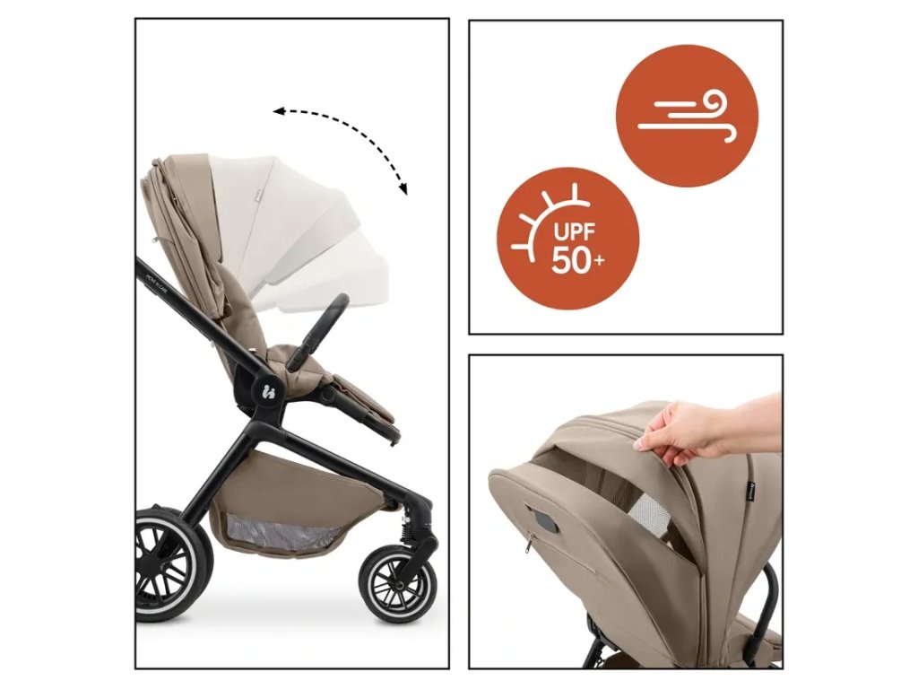 Vďaka terénnym gumovým pneumatikám ste pripravení na všetky trasy. 4-cestné odpruženie umožňuje jemné hojdanie vášho dieťaťa, výsuvná XL slnečná strieška (UPF 50+) chráni vaše dieťatko v každom počasí. Sedadlo kočíka vyniká výškovo nastaviteľným 5-bodovým bezpečnostným pásom a dobre polstrovaným, extra vysokým operadlom. Opierka nôh rastie s vaším dieťaťom.