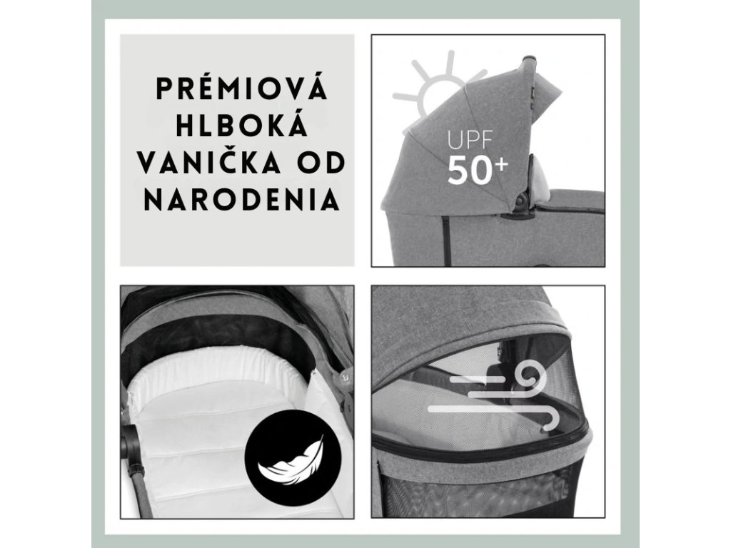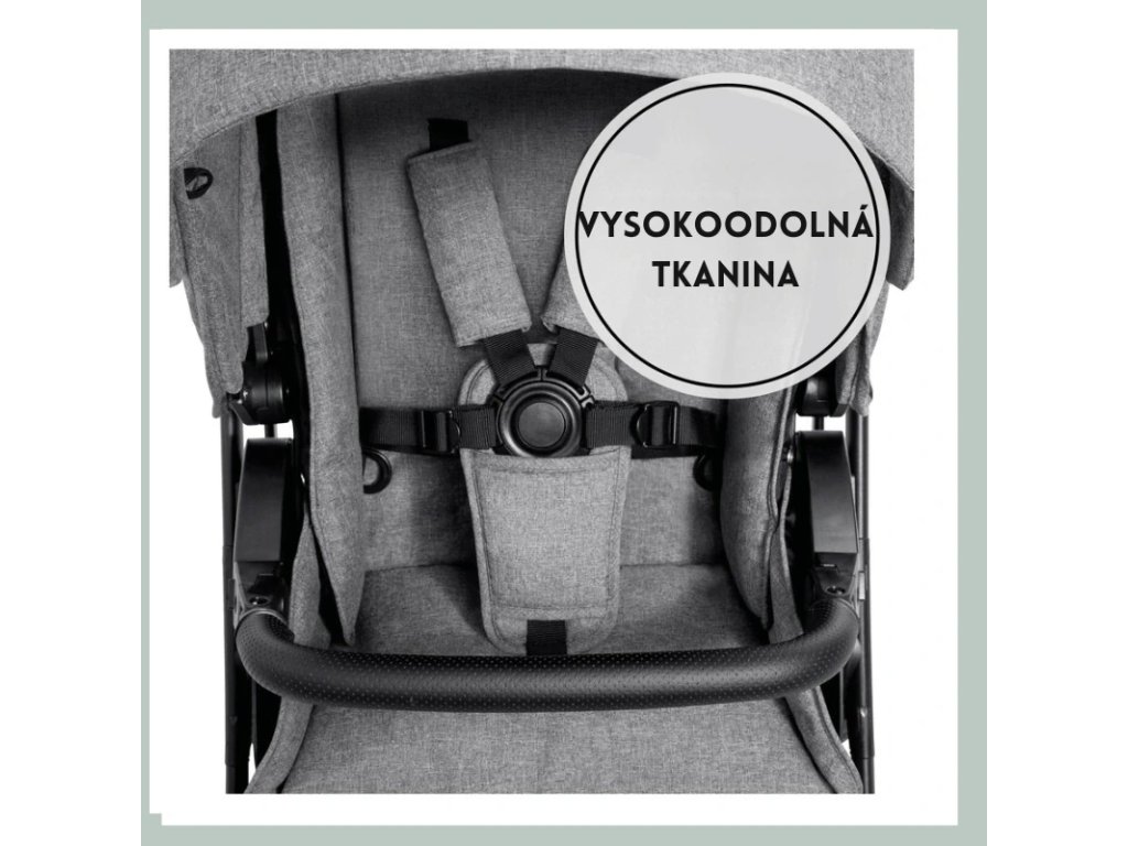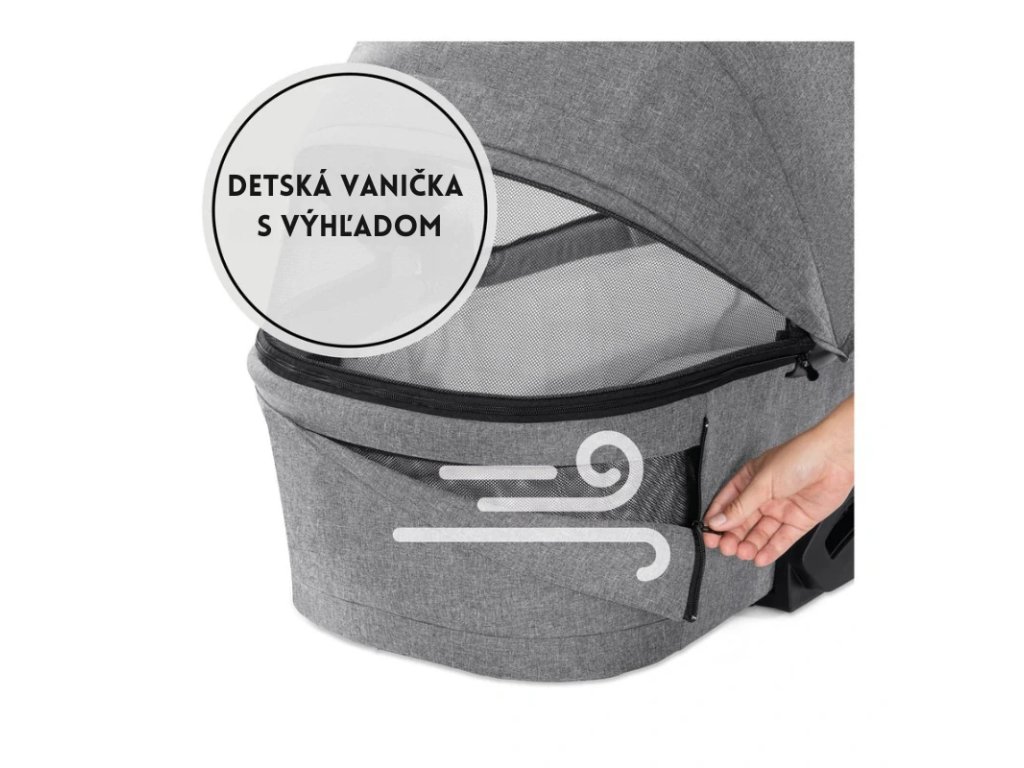 Moderné a ľahko udržiavateľné melanžové látky, a to ako na vaničke, tak aj na detskej sedačke, dopĺňajú vysoko kvalitný interiér.