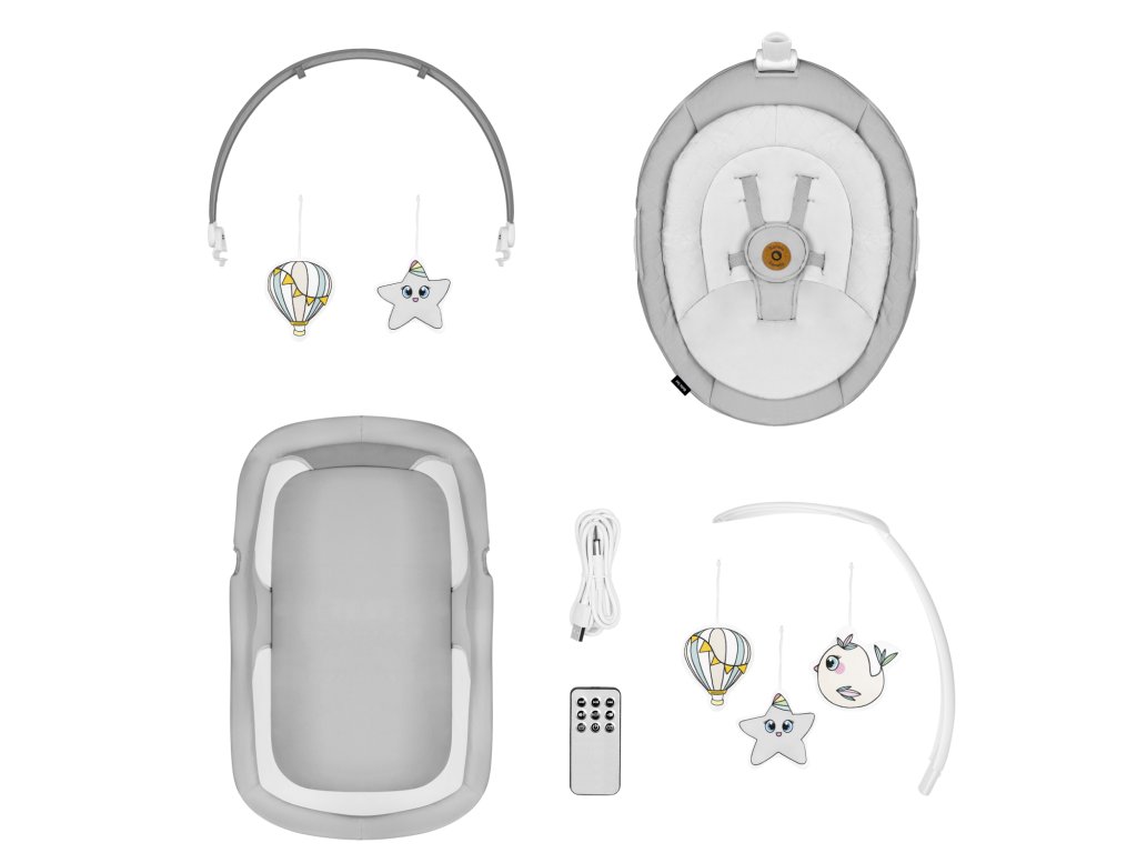 Hojdačka je vybavená mnohými užitočnými funkciami, ktoré rodičom uľahčujú život. Nočný mód spôsobí spomalenie produktu, až kým sa úplne nezastaví. Aktivácia automatický detektor pohybu - zapne hojdanie a hudbu, keď sa dieťatko začne vrtieť. Všetky nastavenia hojdačky ovládate pomocou dotykového panela alebo na diaľku pomocou diaľkového ovládača. Tento model prehráva 12 pokojných melódií s ovládaním hlasitosti.
