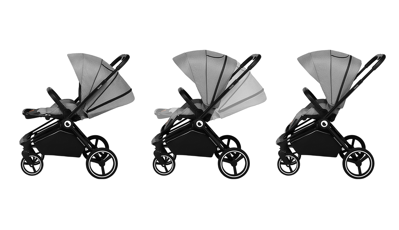 Kočík, ktorý rastie s dieťaťom, je vybavený širokým rozsahom nastavenia chrbtovej opierky a opierky nôh - sedadlo si môžete nastaviť naplocho, ale aj po smere alebo proti smeru jazdy.