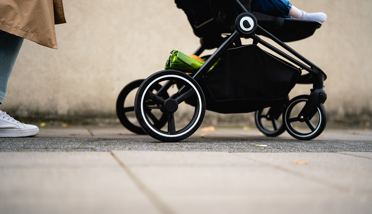 Je vybavený bezúdržbovými kolesami s aretáciou pre priamy chod a plným odpružením.