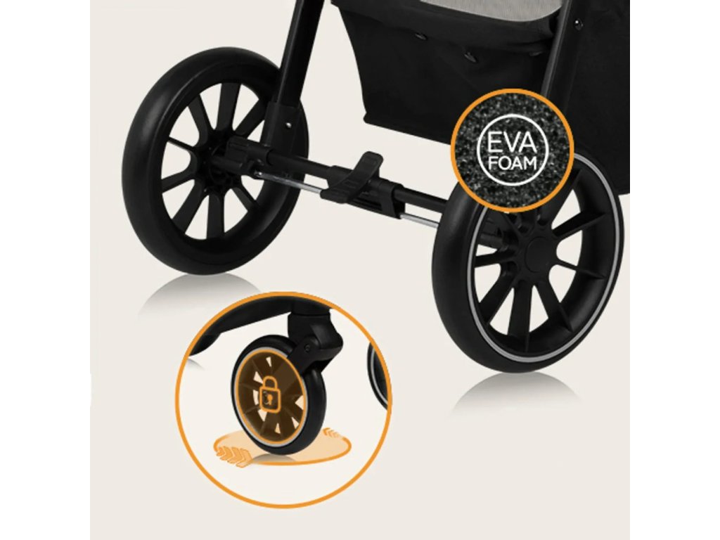 Sú vyrobené z peny EVA, takže nevyžadujú údržbu. Veľké rozmery – 16,5 cm a 24,5 cm – uľahčujú prekonávanie prekážok a nerovností, a to aj jednou rukou. Okrem toho sú predné kolesá pre úplné pohodlie otočné o 360° s možnosťou uzamknutia pre priamu jazdu.