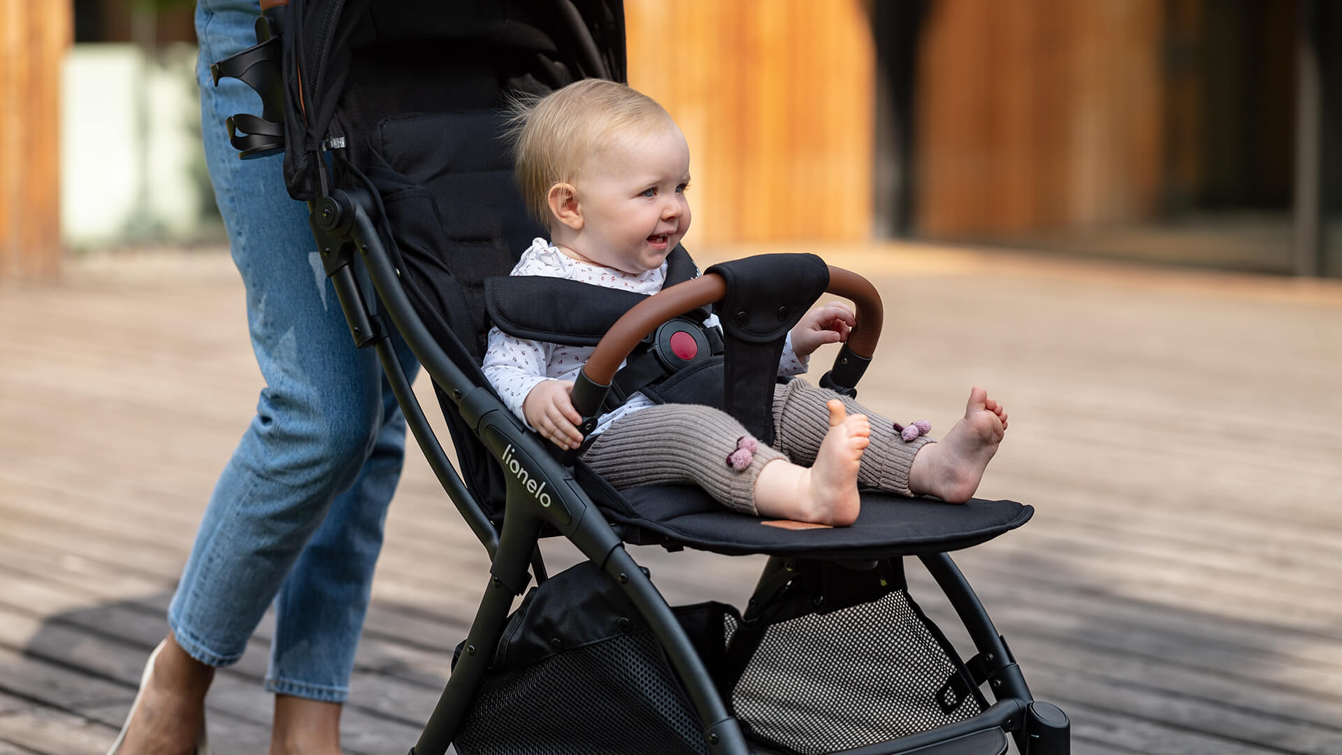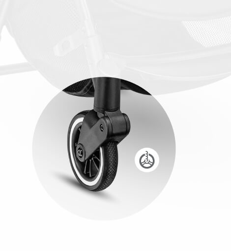 Predné kolesá umožňujú ľahké manévrovanie a poskytujú kočíku neuveriteľnú obratnosť. Gumovo-polyuretánové kolesá zaručujú trvanlivosť, stabilitu a odolnosť proti opotrebovaniu. Tlmiče na všetkých kolesách výrazne znižujú otrasy pri jazde na nerovnom povrchu a pohodlná brzda zaručuje vynikajúcu ovládateľnosť. Kolesá sú oveľa väčšie ako u väčšiny takých kompaktných kočíkov - 15 cm (vzadu), 13 cm (vpredu).