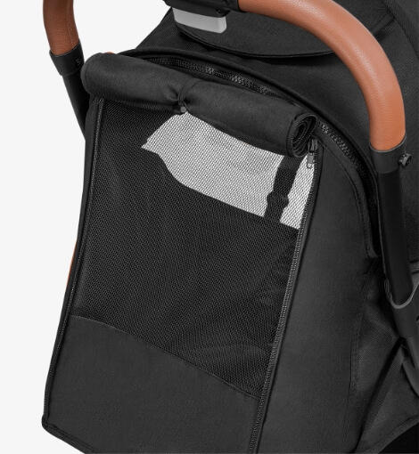 Zatvárateľné vrecko na zadnej strane kočíka je ideálne pre uloženie malých predmetov - telefónu, peňaženky alebo malých hračiek.