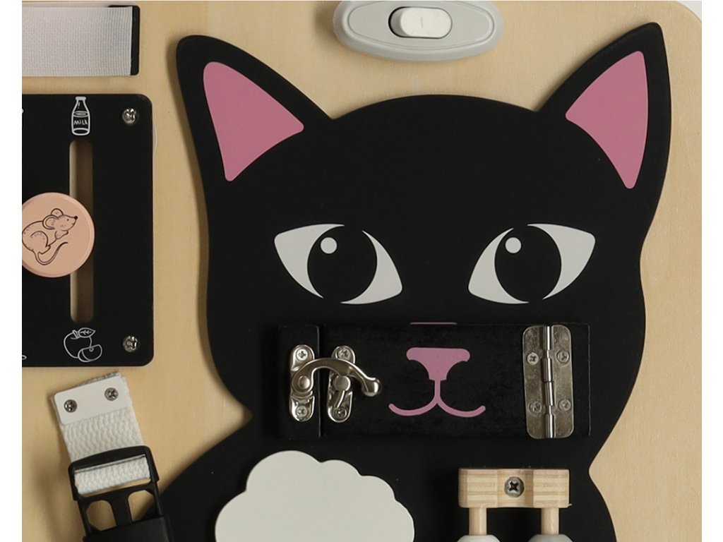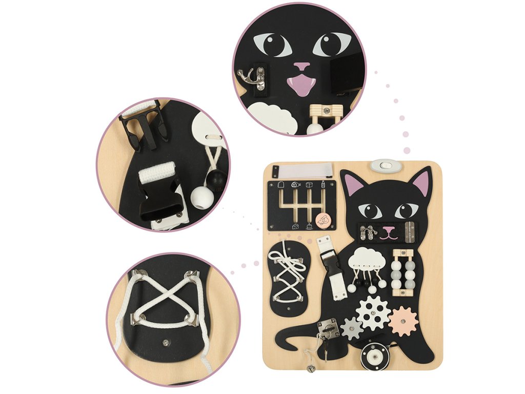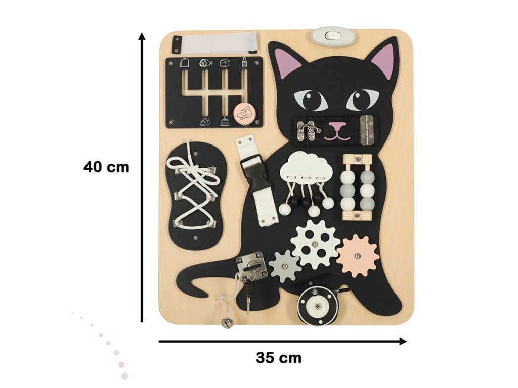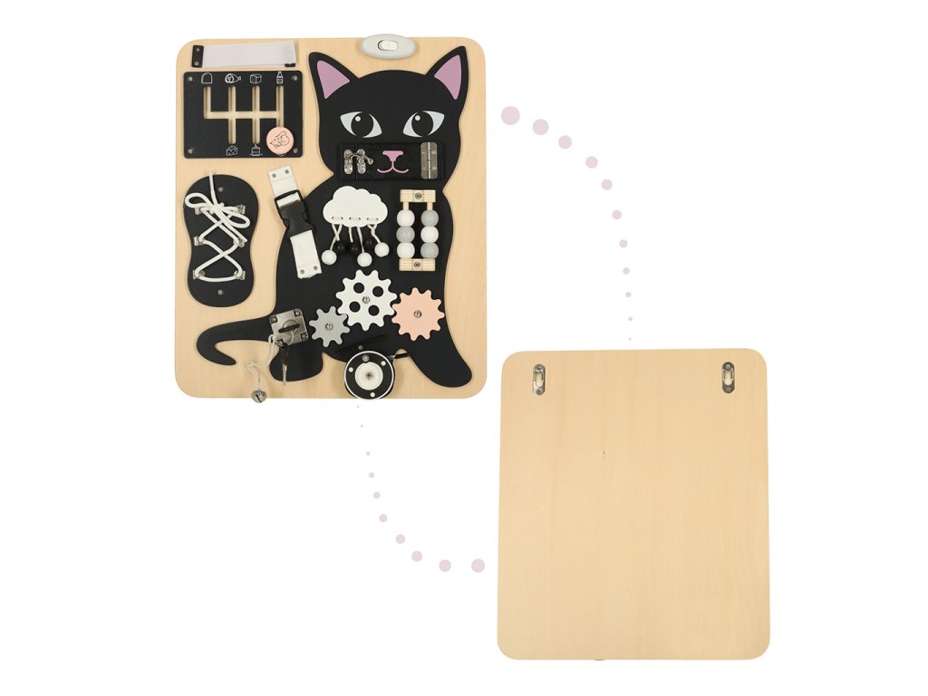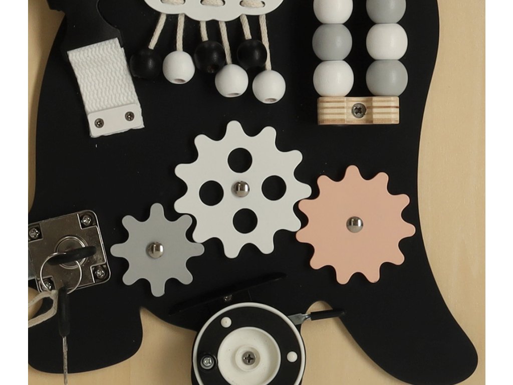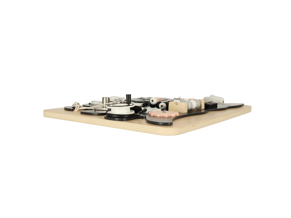 Tabuľa obsahuje rôzne interaktívne prvky : Špáradlá ,Topánka so šnúrkami ,Bludisko v štýle prevodovky ,Kovový posúvač, Zámok s kľúčmi a mnoho ďalších! Všetky komponenty manipulačnej dosky sú pevné a majú skutočne uspokojivú životnosť. Každý komponent prežije mnoho hodín ťahania, viazania, ale aj klepania!