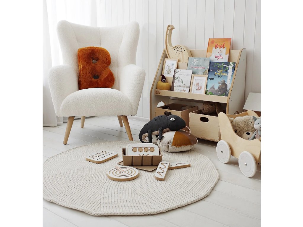 Drevená knižnica pre deti je kombináciou jednoduchých foriem a mimoriadnej funkčnosti. Drevené police a prídavné boxy na hračky uľahčia uloženie kníh, obľúbených plyšových medvedíkov, bábik, ale aj kociek či spoločenských hier. Už žiadny neporiadok v detskej izbe – batoľa si bude môcť samo oddeliť hračky a po skončení hry ich vrátiť na svoje miesto. Detská knižnica umožňuje vystavovanie kníh s obálkou smerom dopredu, čo bude pre dieťa mimoriadne dôležité. Batoľa, ktoré ešte nevie čítať, ľahko spozná svoju obľúbenú knihu podľa obalu.