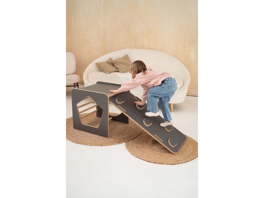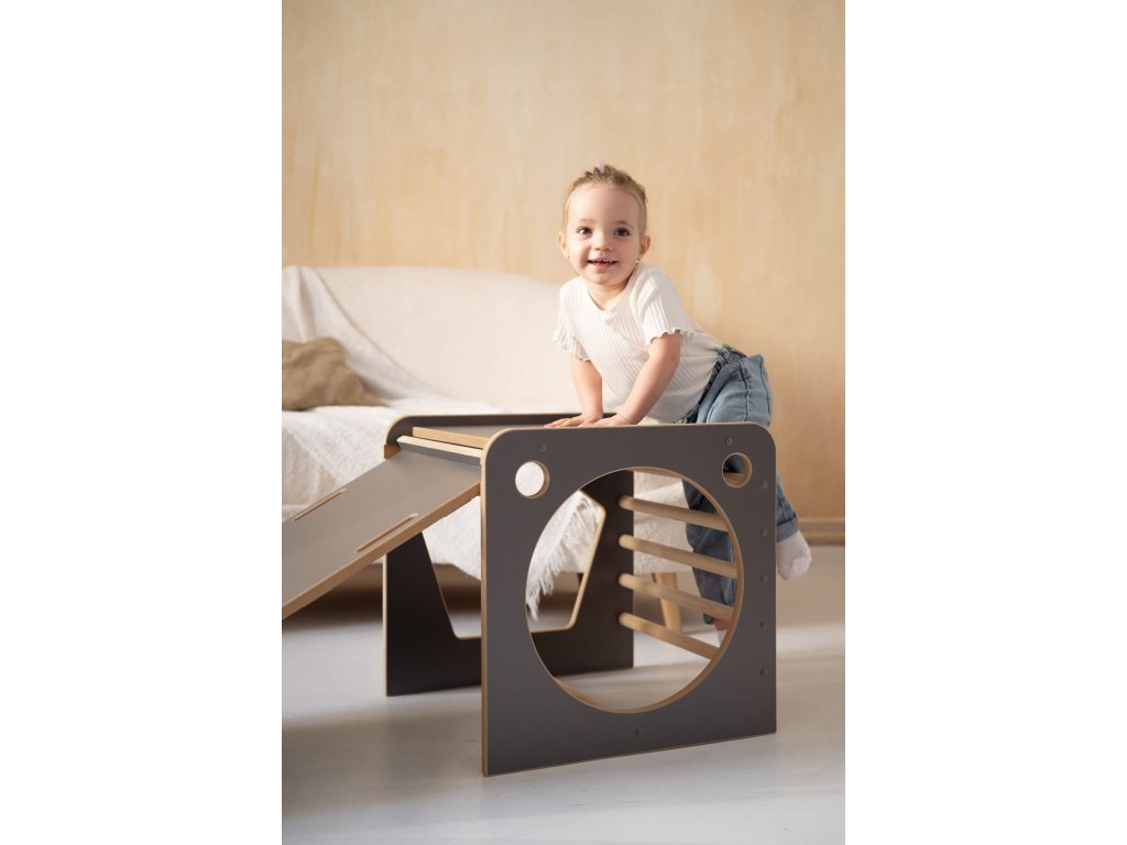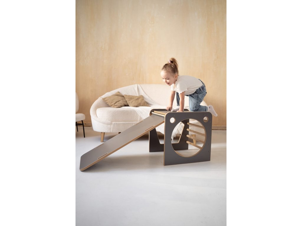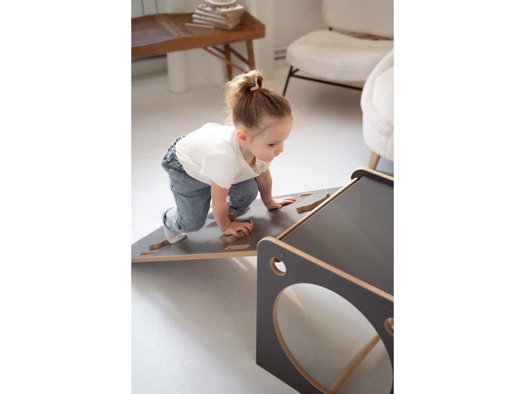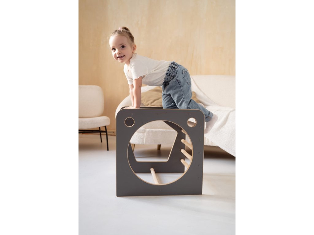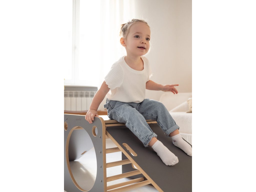 Montessori viacúčelová kocka so šmýkačkou, obláčiky sivá
