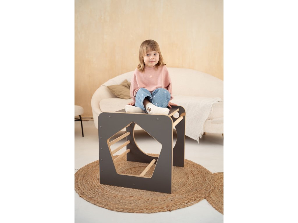 Na jednej strane má kocka priečky, po ktorých môžete stúpať a precvičovať si motorickú koordináciu. Po stranách sú otvory s tvarmi, ktoré sa dajú využiť na učenie a hranie – teda pohyb medzi nimi. A úplne hore je stolová doska určená na kreslenie, maľovanie a iné umelecké aktivity.