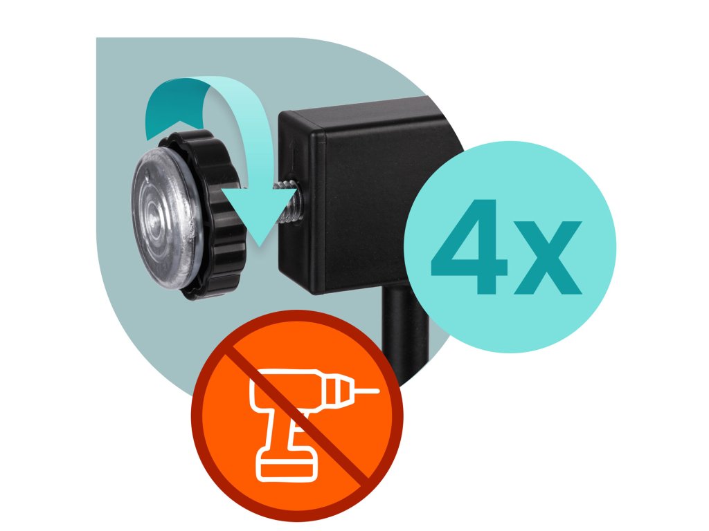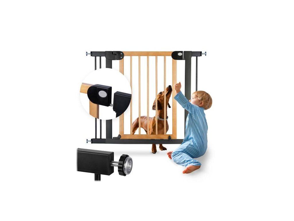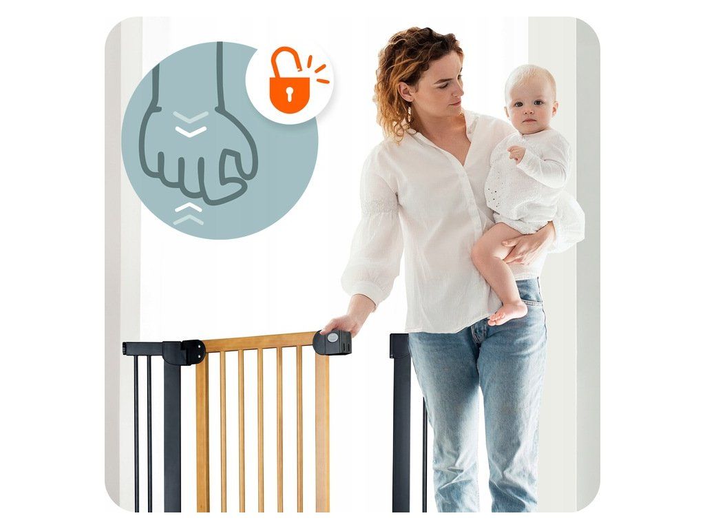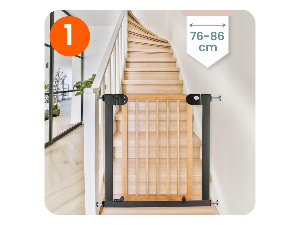 Montáž zábrany na schody je jednoduchá a nevyžaduje použitie náradia. Brána sa upevňuje pomocou štyroch upevňovacích bodov s využitím dilatačných škár, čo eliminuje potrebu vŕtania a predchádza poškodeniu stien alebo zárubní. Po inštalácii ponúka stabilnú a bezpečnú ochranu. Je dôležité poznamenať, že brána je po vybratí z krabice mierne otvorená, čo je zámerné pre zaistenie optimálnej stability po montáži.