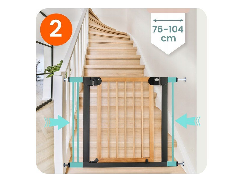 Zábrana na schody má nastaviteľnú šírku v rozmedzí 76 až 104 cm, umožňuje jej inštaláciu do rôznych dverí alebo priechodov. Jej výška je 77 cm, zabezpečuje dostatočnú ochranu pre malé deti. Navyše obsahuje dva predlžovacie prvky a štyri nastavovače šírky, ktoré uľahčujú prispôsobenie na požadovaný rozmer.