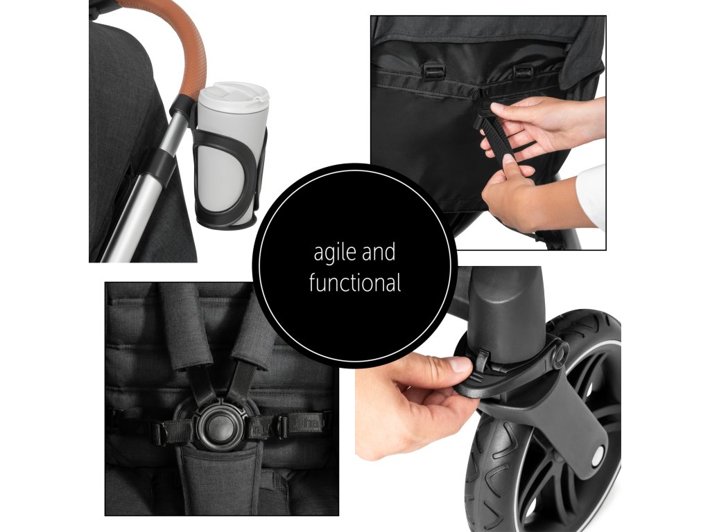 - Vybavenie: držiak na pohár/držiak na flašku, nastaviteľné, poťahom obtiahnuté madlo , spodný košík, vankúšik na rameno