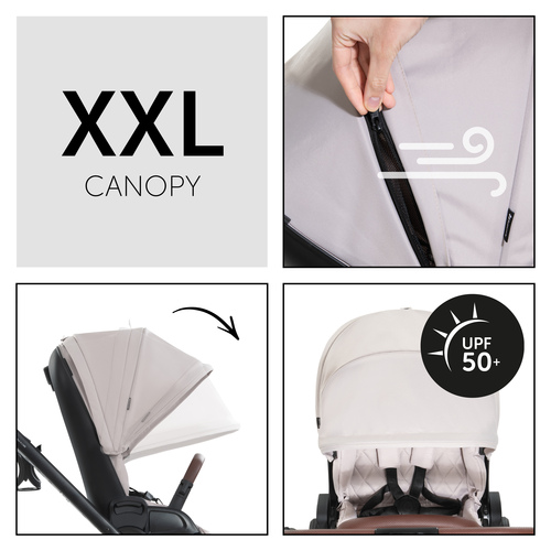 Slnečná strieška XXL rozmerov je z kvalitných textílií. So zabudovanou ochranou UPF 50+ poskytne Vášmu dieťaťu ochranu pred slnkom, hlukom a vetrom. Trojzónovú striešku si môžete ľahko nastaviť podľa potrieb dieťaťa, a to vďaka zipsom, ktoré ju predlžujú. V strieške je po jej rozopnutí zabudované aj náhľadové okienko zo sieťoviny.
