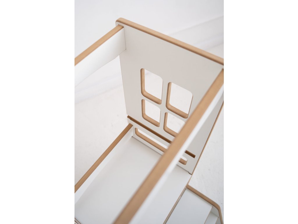 Pevne vyrobená z laminovanej dosky, má všetky hrany starostlivo zaoblené - a priečka na zadnej strane navyše zabraňuje jej vypadnutiu.