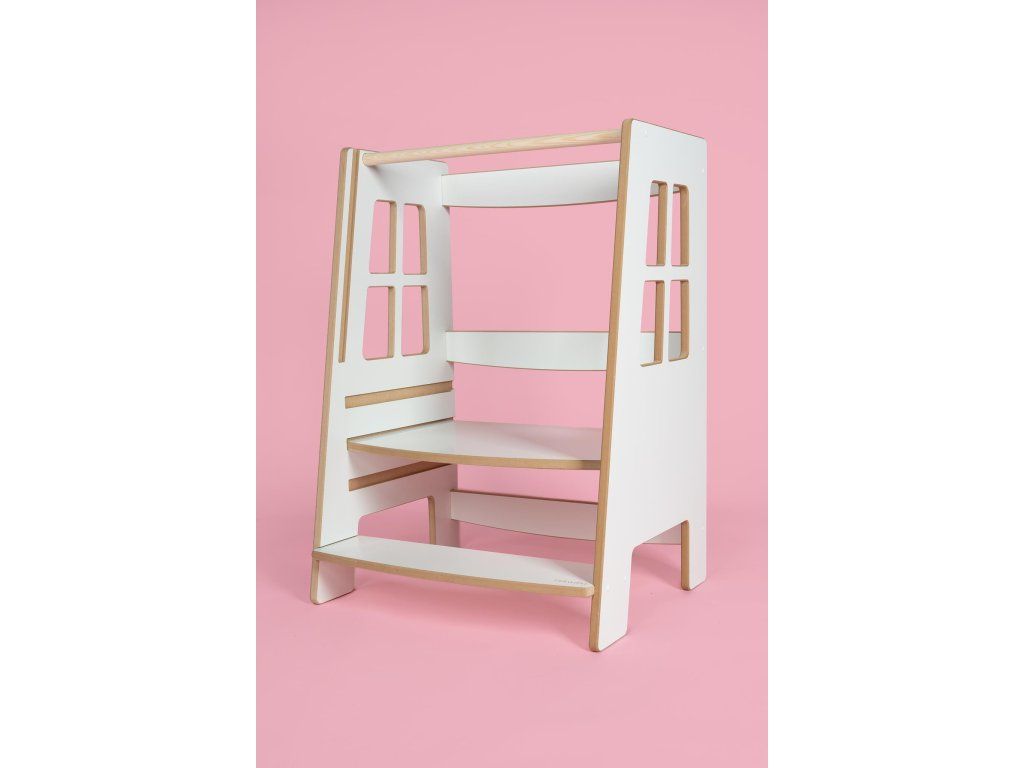 Kuchynský pomocník DOUBLE SAFE je predovšetkým BEZPEČNÝ. Vzadu má hrazdu a západku, ktorú je možné vysunúť, aby sa batoľa samo vyšplhalo na pomocníka - vďaka nej znižujeme riziko, že dieťa pri hre spadne dozadu. Vďaka 3-stupňovému nastaveniu plošiny pomocník rastie s dieťaťom a bude slúžiť veľmi, veľmi dlho - výšku možno nastaviť bez nutnosti odskrutkovania. V spodnej časti je schodík pre ľahký prístup. Pomocník je stabilný vďaka vhodnému dizajnu a hmotnosti výrobku.