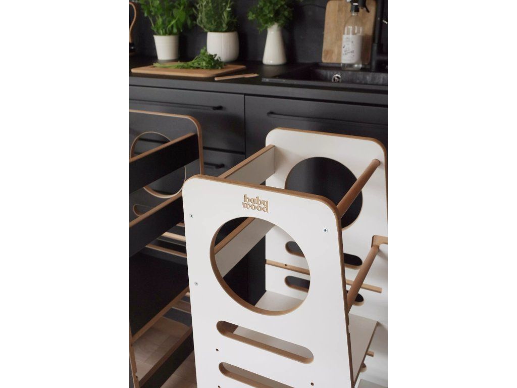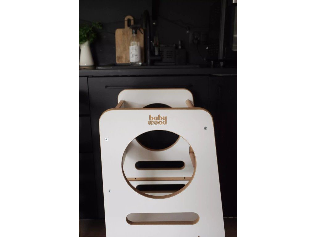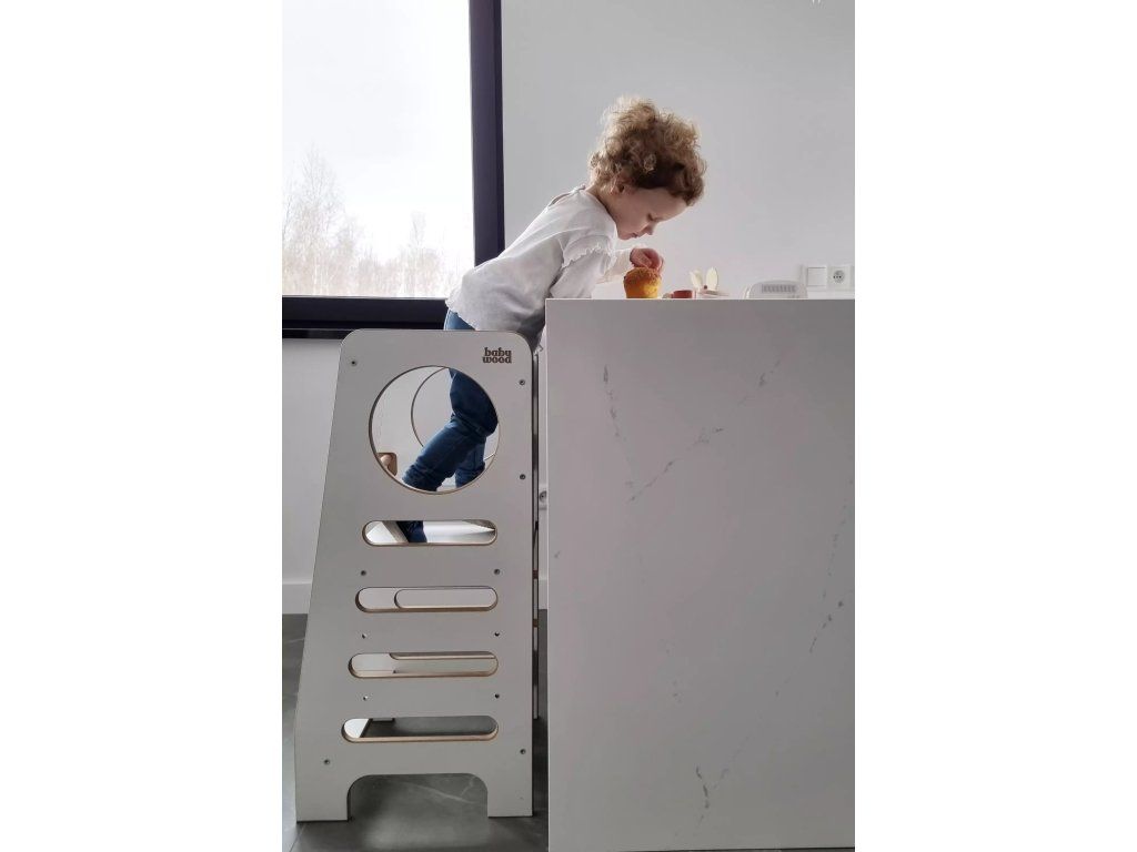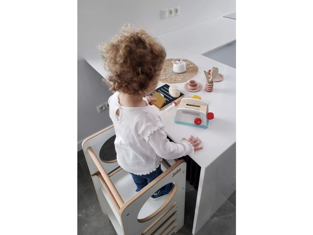 Kuchynský pomocník má 3-stupňové nastavenie plošiny, vďaka čomu ho ľahko prispôsobíme aktuálnym potrebám dieťaťa bez ohľadu na vek. Jeho veľkými atribútmi sú tiež zaoblené hrany a prídavné priečky, ktoré zaistia bezpečnú hru pre batoľa.