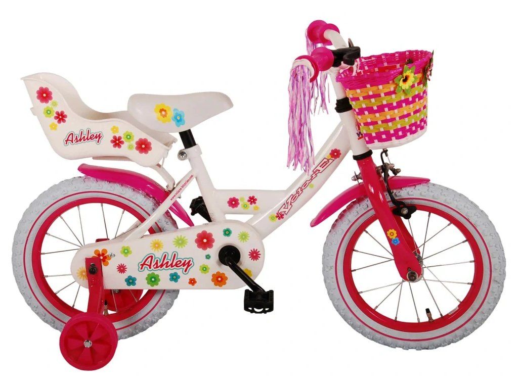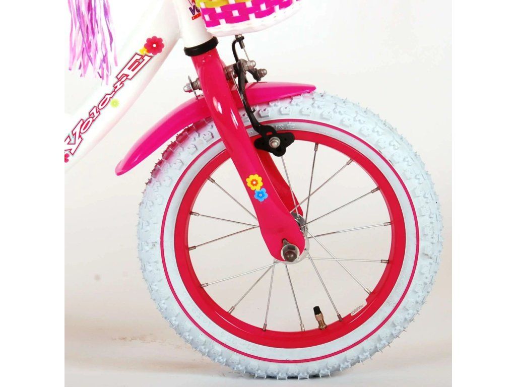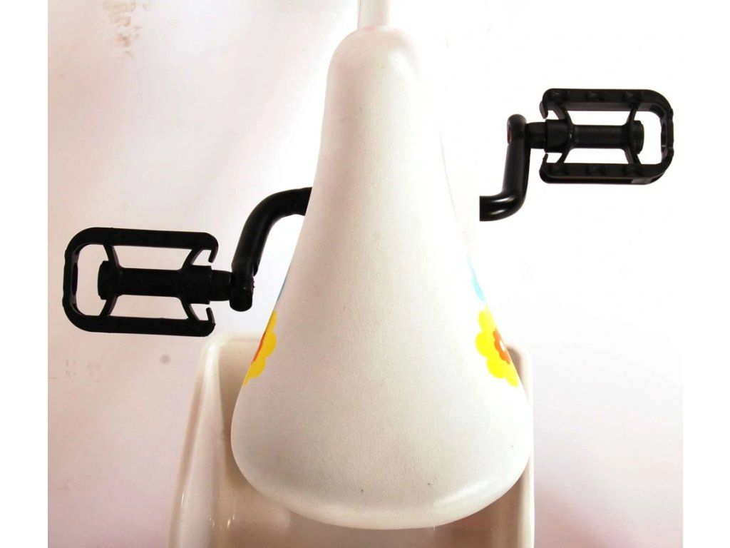 Bezpečnosť je na prvom mieste! Preto má tento štýlový bicykel ručnú brzdu, zadnú brzdu a uzavretý kryt reťaze. Okrem toho má bicykel odnímateľné bočné kolieska, odrazky v pedáloch a pekný zvonček. Myslelo sa aj na pohodlie. Krásny kvietkovaný biely bicykel Volare má sedadlo pre bábiku pod sedlom, košík na všetky vaše veci, super pevný rám a zábavnú dekoráciu na riadidlách. Aby ste si bicykel užívali čo najdlhšie, sedadlo a riadidlá sú výškovo nastaviteľné. Skrátka: špičkový bicykel, ktorý si vaše dieťa bude užívať dlhé roky!