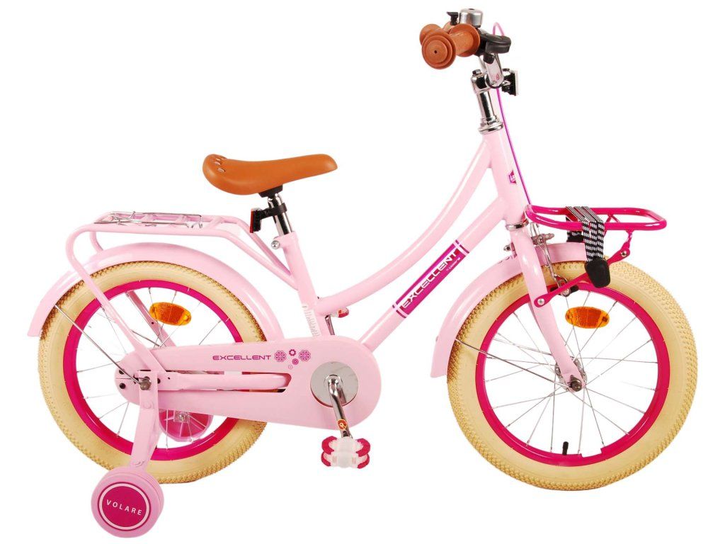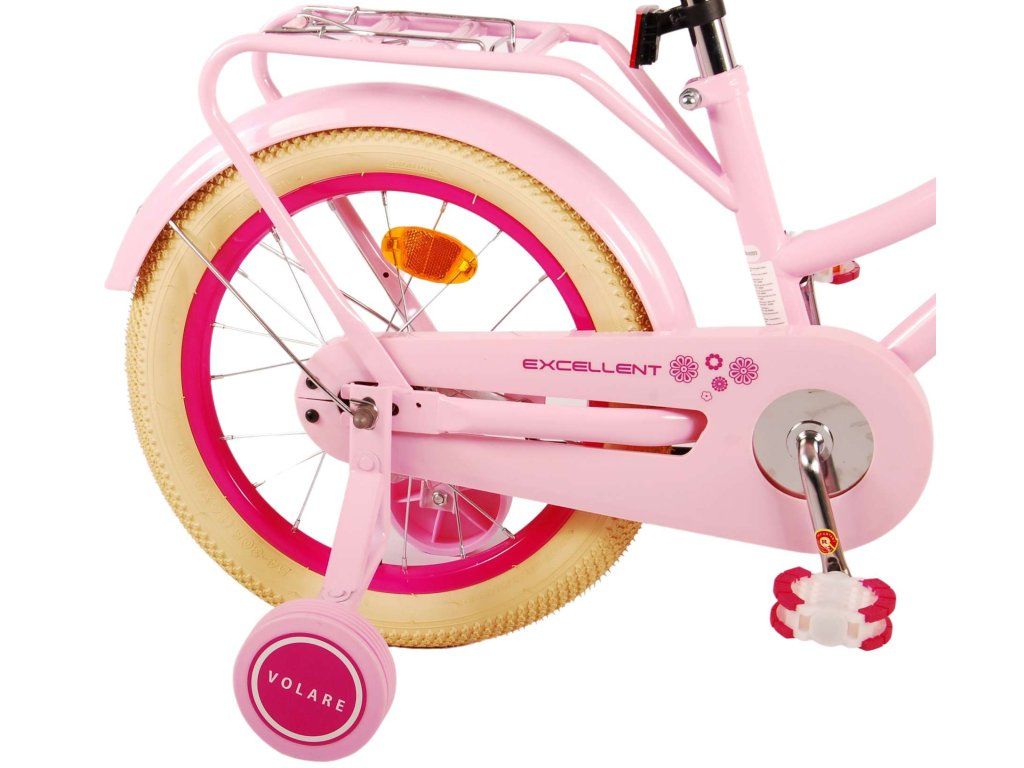 Bezpečnosť je na prvom mieste! Preto má tento cool bicykel ručnú brzdu a zadnú pedálovú brzdu, odnímateľné bočné kolesá a uzavretý kryt reťaze. Okrem toho má bicykel odrazky vpredu aj vzadu a pekný zvonček. Myslelo sa aj na pohodlie. Pekný ružový bicykel Volare má šikovný predný nosič s rýchloupínacími popruhmi, zadný nosič integrovaný v ráme a luxusné mäkké sedlo. Aby ste si bicykel užili čo najdlhšie, sedadlo a riadidlá sú výškovo nastaviteľné. Dodáva sa so všetkým montážnym materiálom potrebným na zostavenie bicykla!