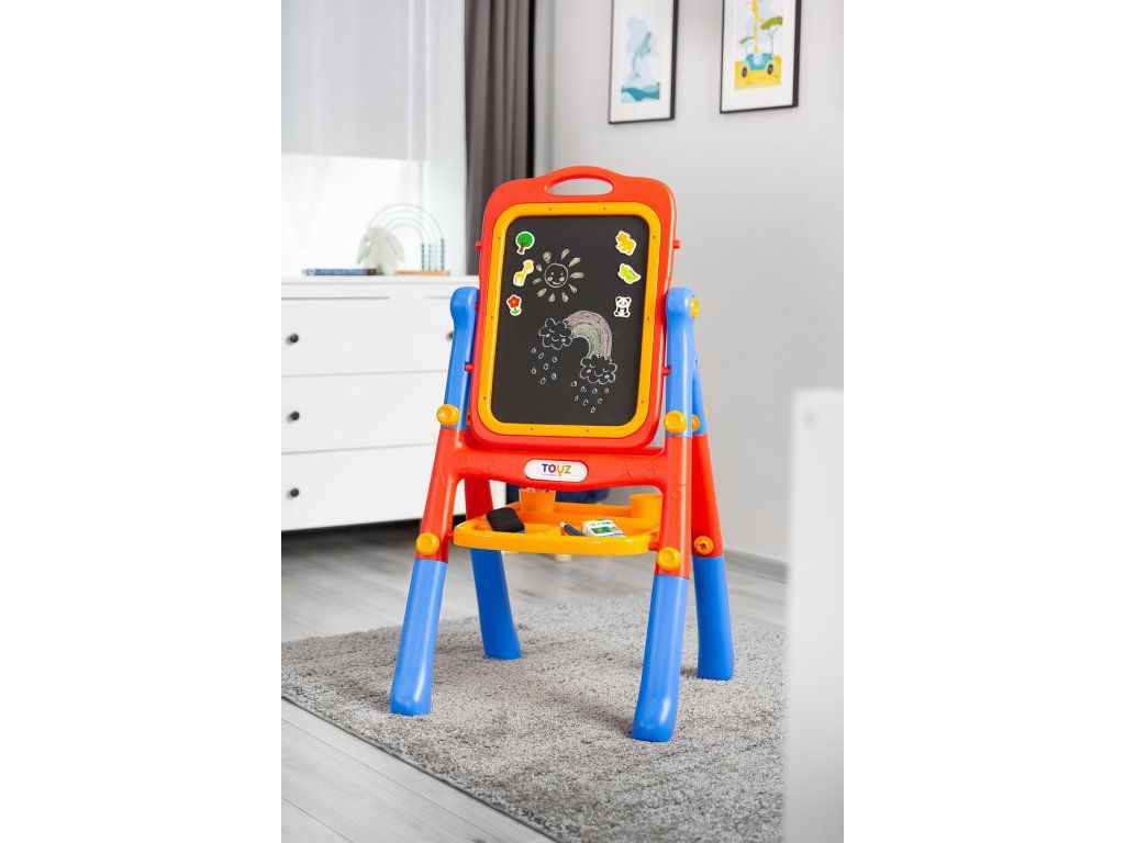 Čo tým získaš? - Hračka, ktorá rozvíja predstavivosť - Obojstranná - klasická tabuľa a tabuľa s fixkou - Magnetické - obe strany umožňujú prichytenie magnetov - Dobre vybavené: súčasťou sú fixky, krieda, magnety a špongia na utieranie - Montáž bez použitia náradia pre rýchle nastavenie .